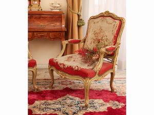 Coppia di poltrone in legno laccato e lumeggiato in oro