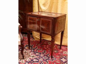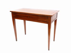 h cm 79x99x48,5 fine del XVIII secolo intarsiato con doppia filettatura, un cassetto nella fascia, gambe a fa [..]