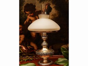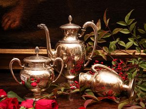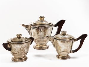 gr 750, h da cm 11 a cm 16 (3) Anni Trenta di gusto Decò, prese in legno, composto da teiera, lattiera e zucc [..]
