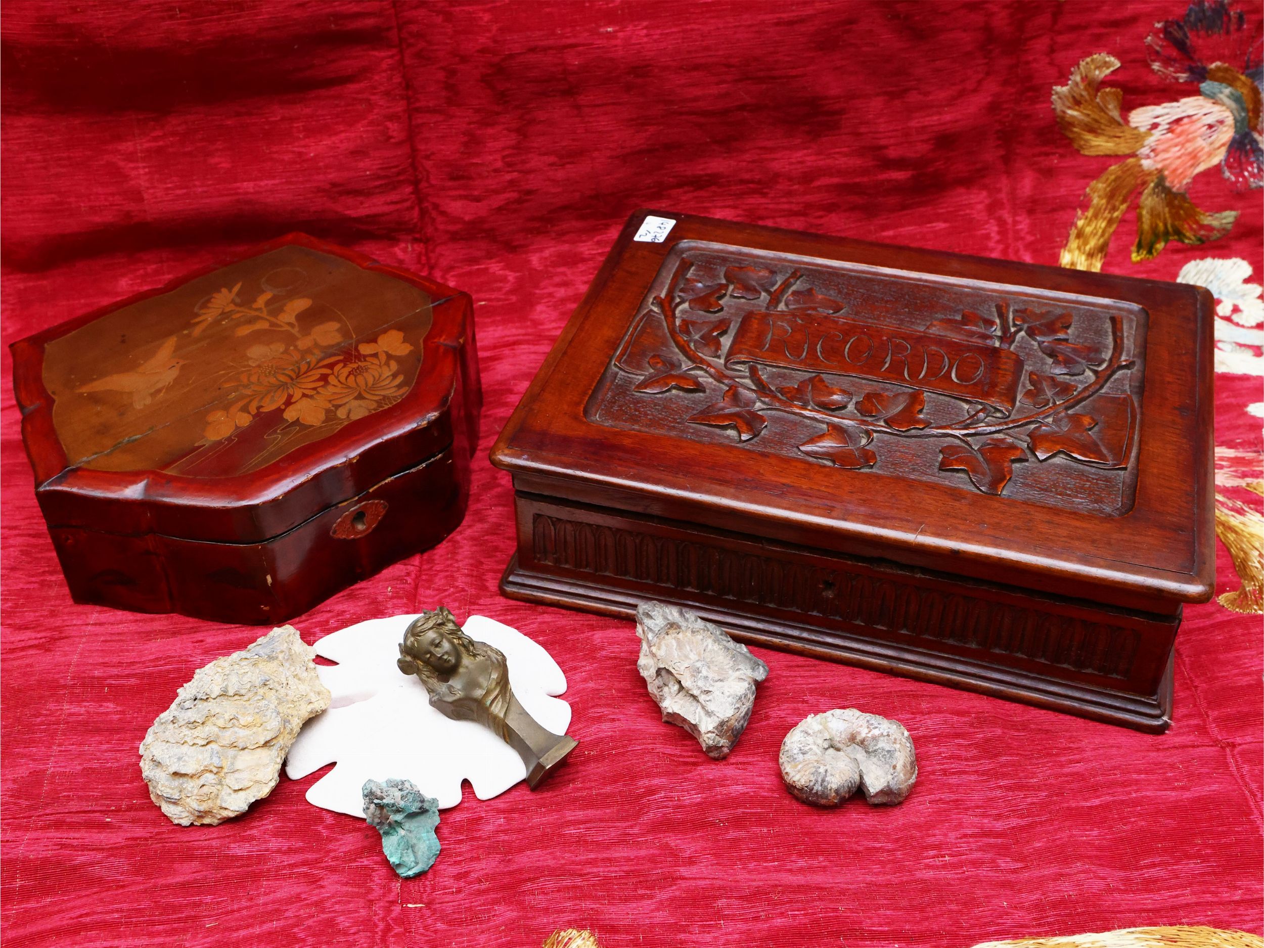 h cm 7x26x20 e cm 7x20x16 (2) inizio del XX secolo una scatola portagioie in noce, coperchio intagliato con la scritta Ricordo entro cartiglio tra ghirlande di foglie d'edera, interno con specchio e doppio fondo, all'interno alcune vecchie monete, un sigillo liberty ed altre piccole cose; ed un'altra scatola per cioccolatini in lacca, coperchio decorato a chinoiserie dorate, all'interno iscritto Cioccolato Moriondo e Gariglio Torino, difetti