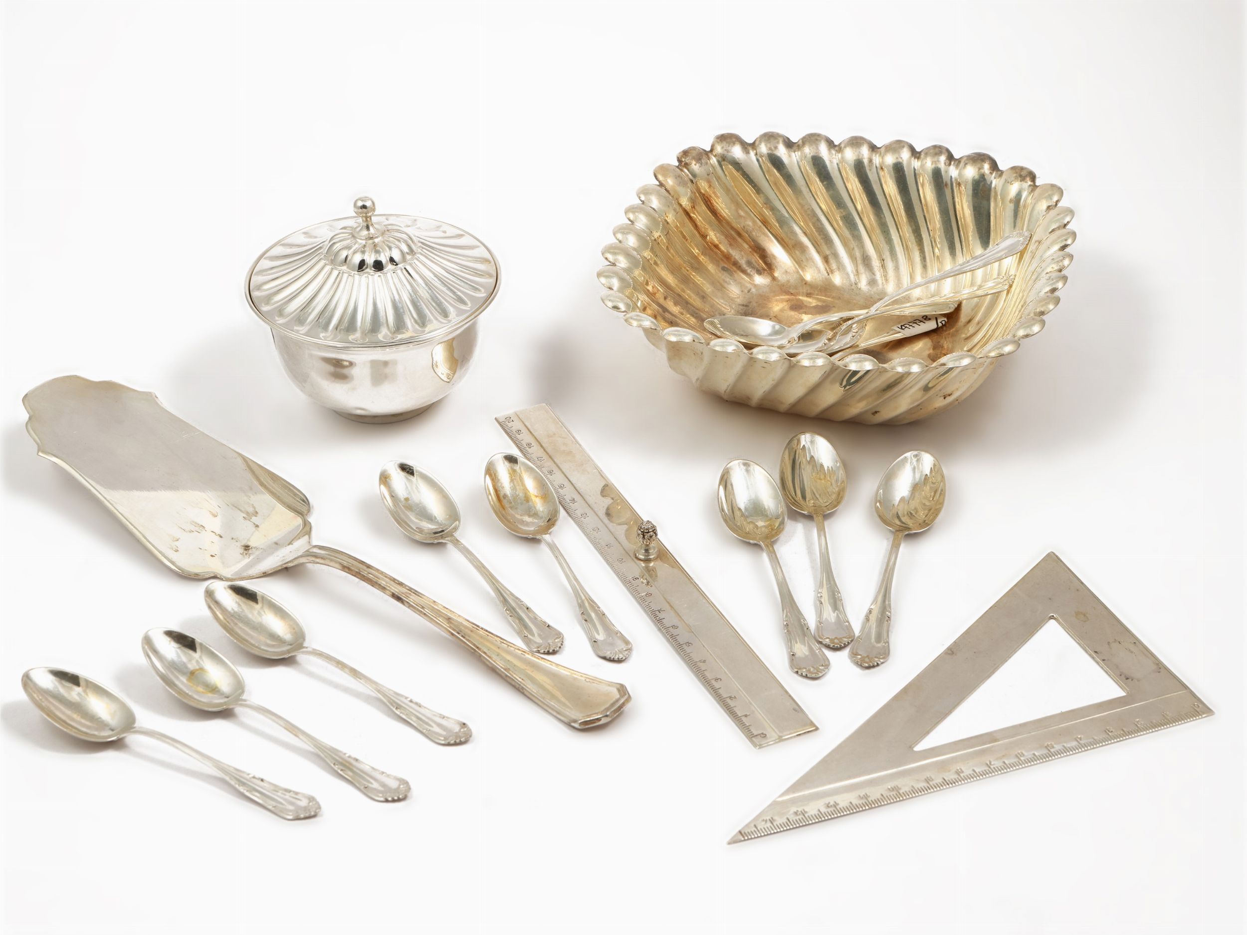 tra cui un cestino porta bon-bon baccellato, una posata a servire da dolce, un righello e una squadra