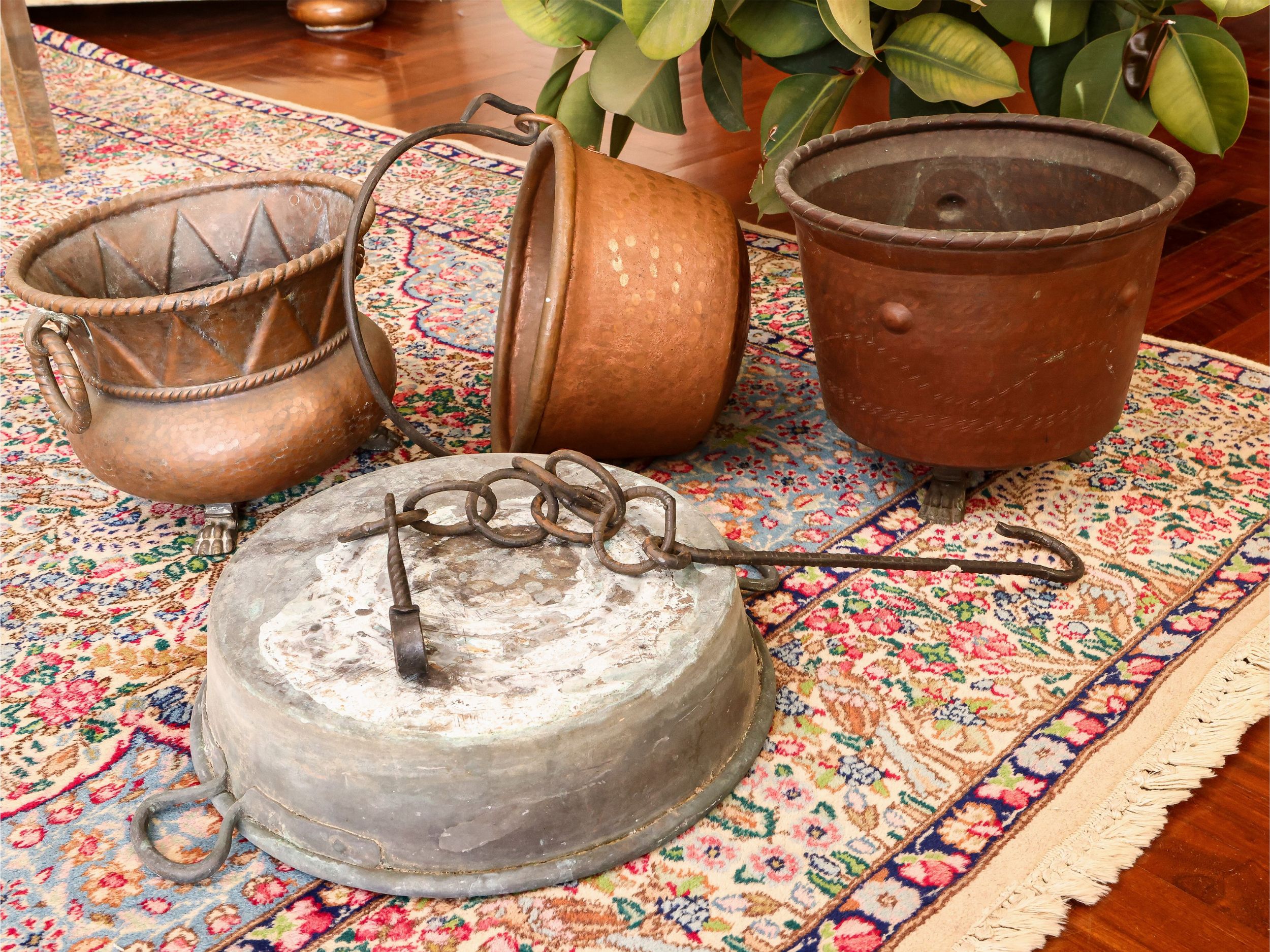 composto da due cachepot su piedi ferini, un paiolo con catena ed una grande teglia circolare, difetti