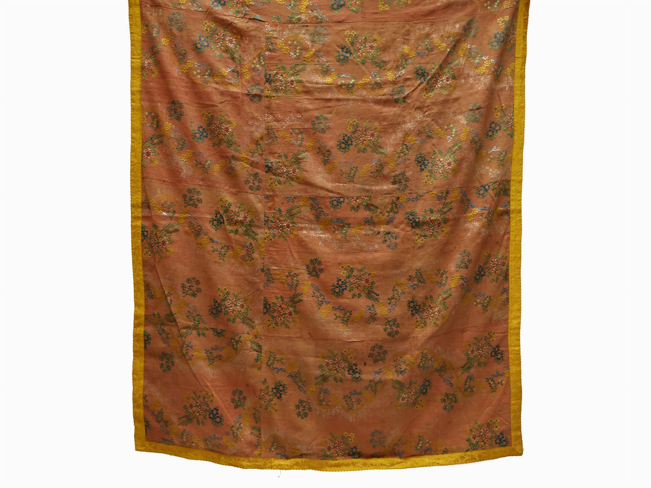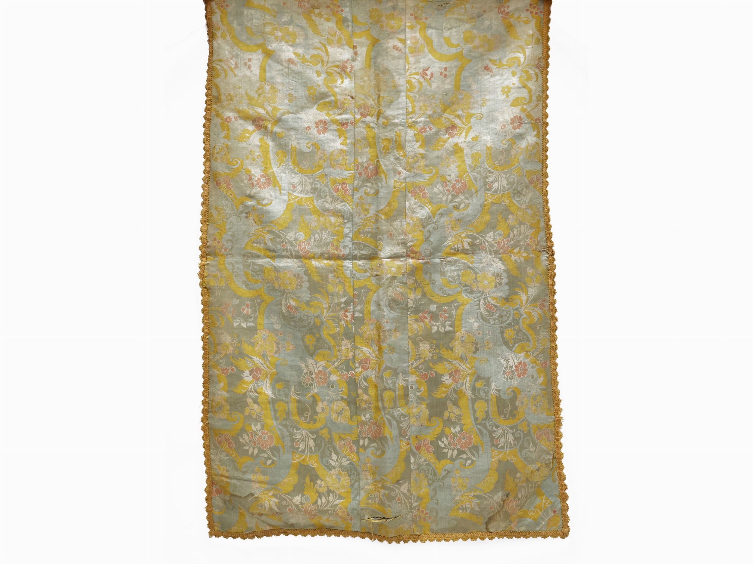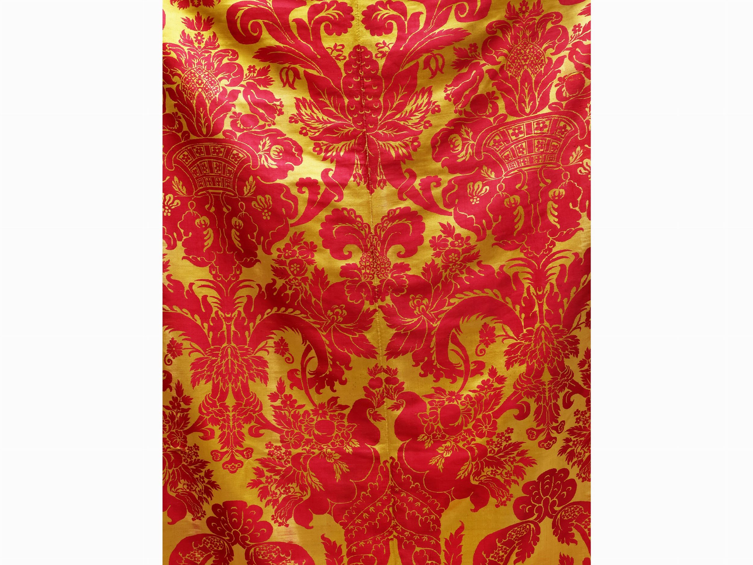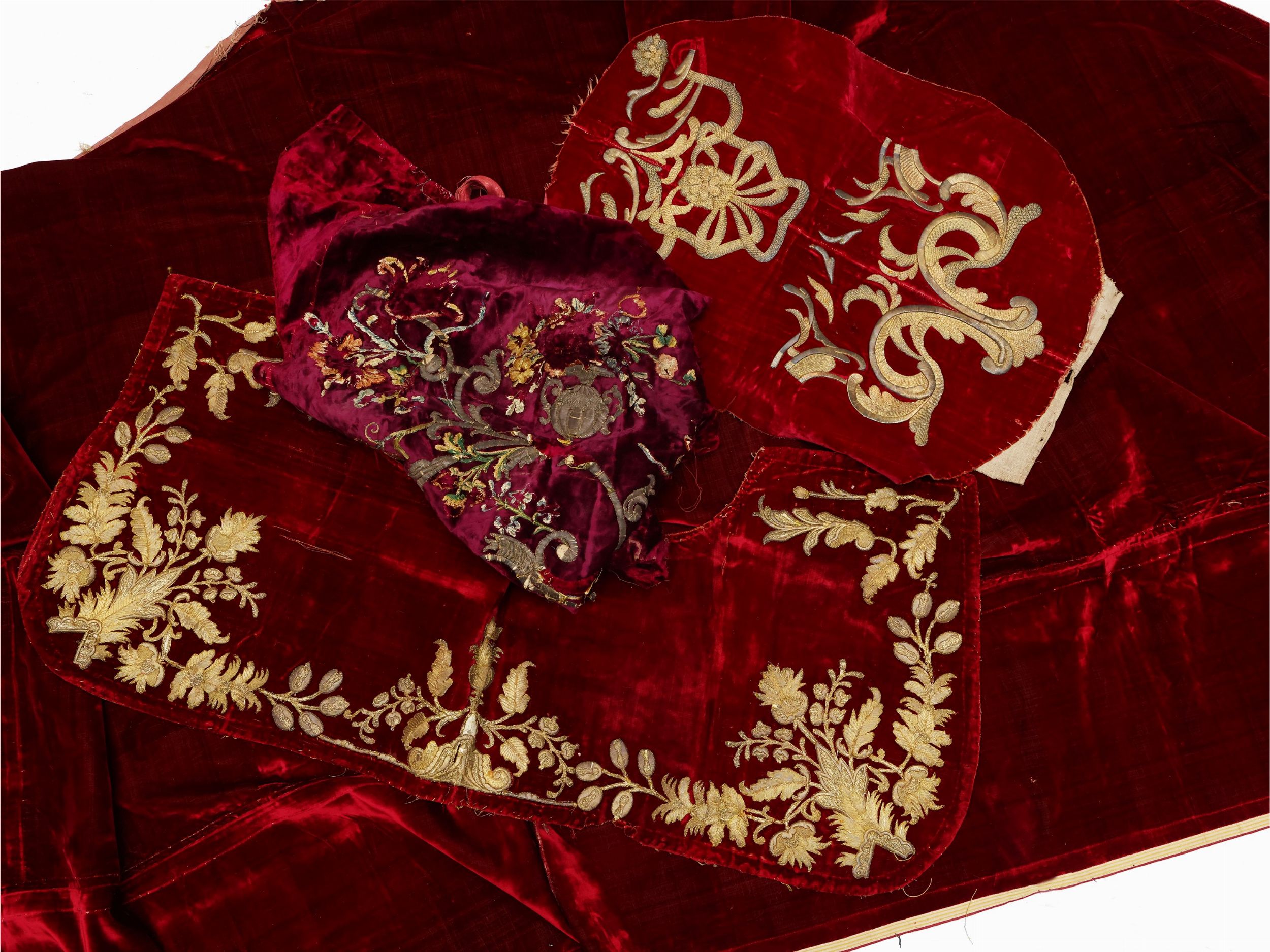 tendaggio cm 240x150 circa (15) XVIII/XIX secolo tra cui un tendaggio in due pannelli in damasco fondo giallo oro ed opera cremisi, bordo a frangia; un pannello in raso cremisi riccamente ricamato in sete policrome con grandi motivi floreali stilizzati e volatili e due frammenti in velluto rosso ricamati in fili dorati, difetti e mancanze