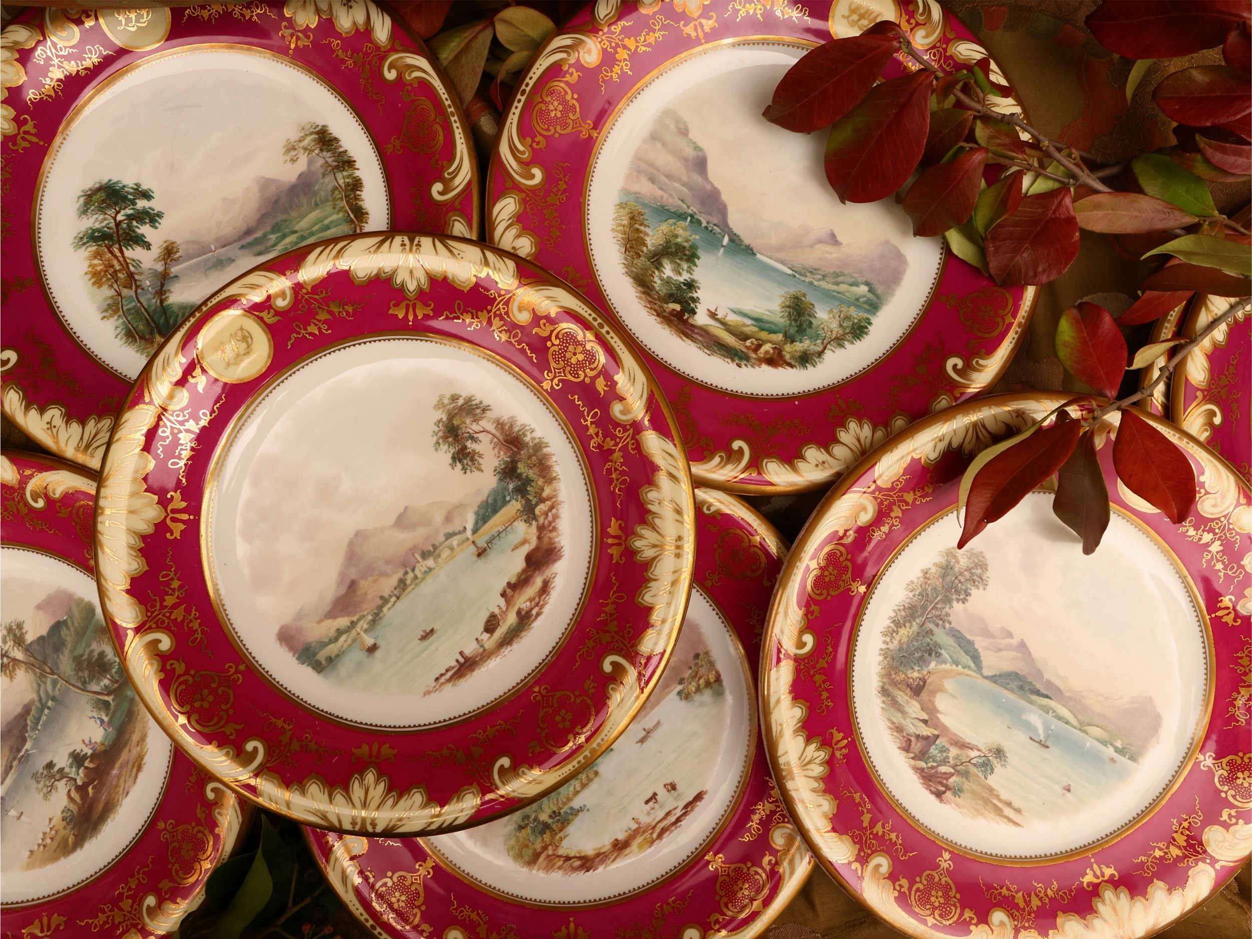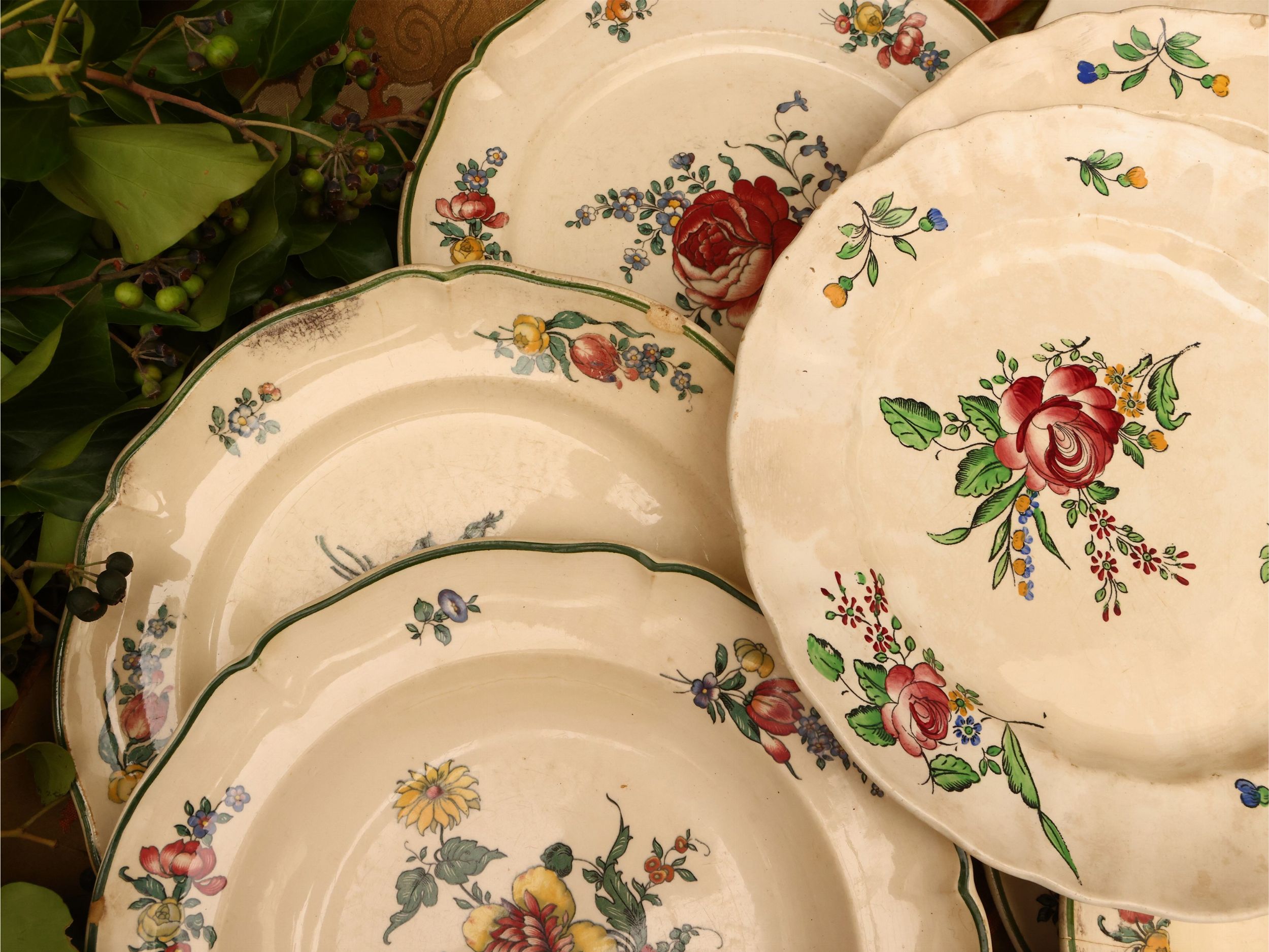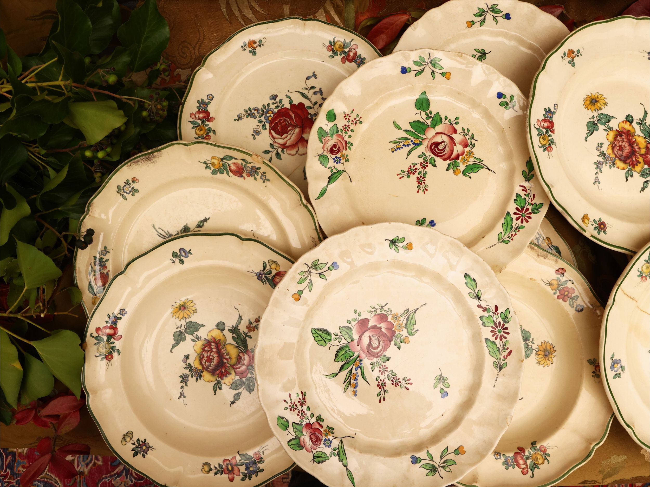 XIX/XX secolo composto da una serie di otto piatti in porcellana inglese dipinti con paesaggi e lumeggiature dorate, sei piatti con vedute orientali e undici piatti in terraglia, di cui otto Villeroy e Boch e tre Ginori, decorati con motivi floreali, difetti (25)