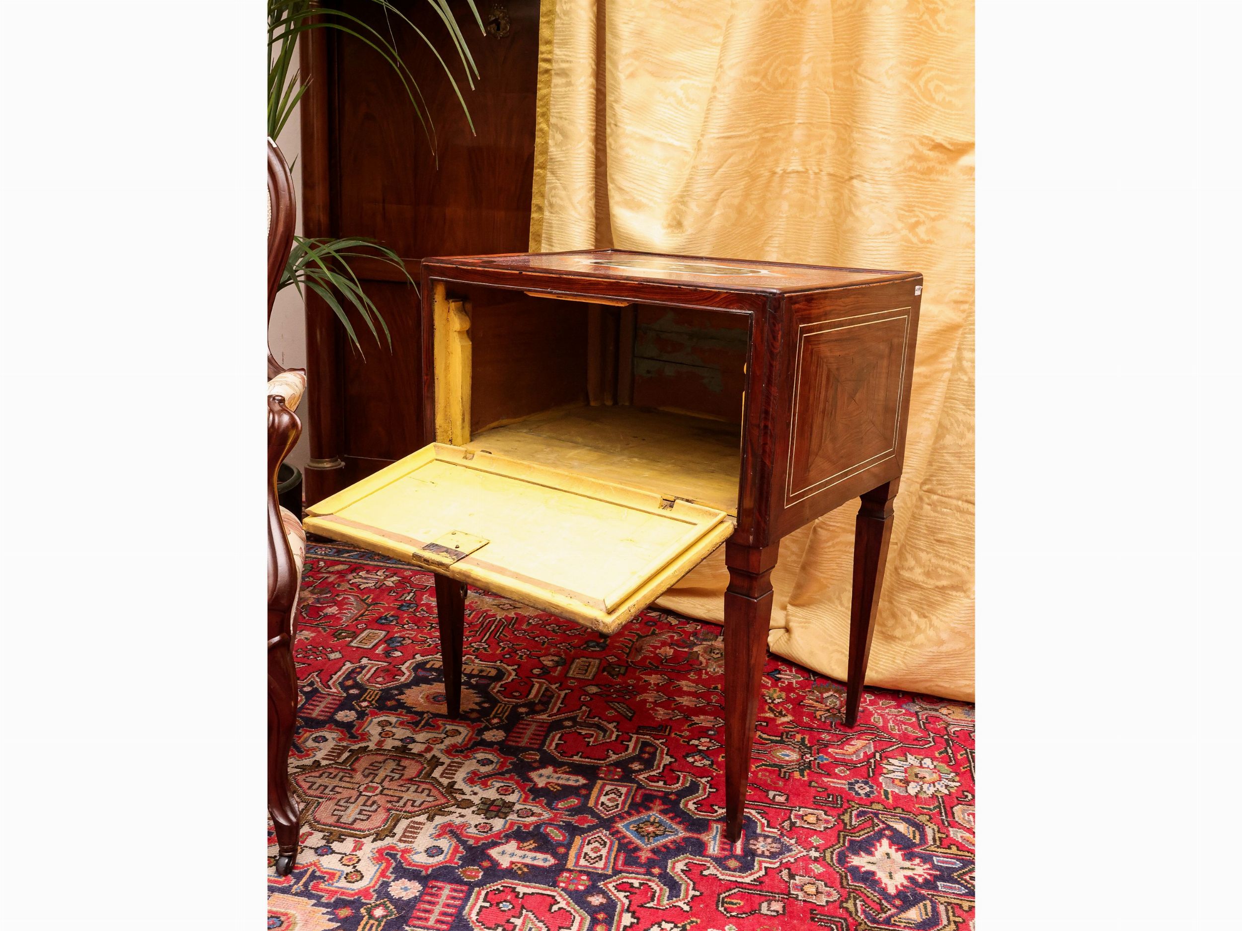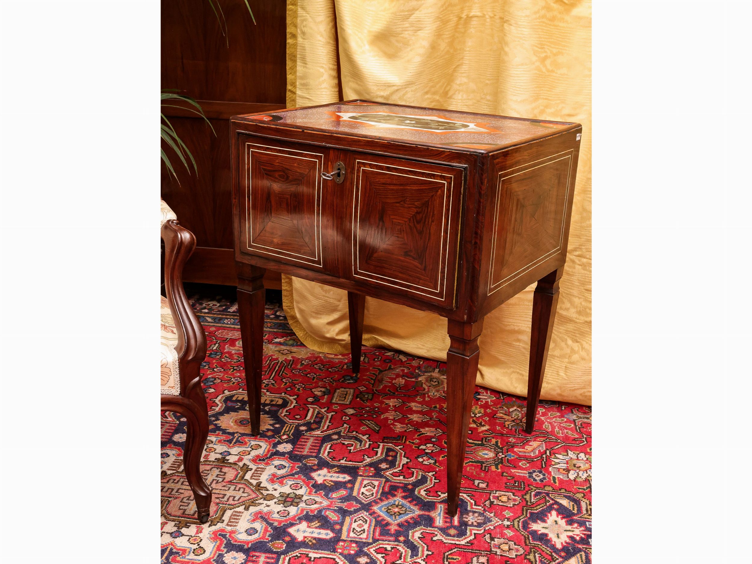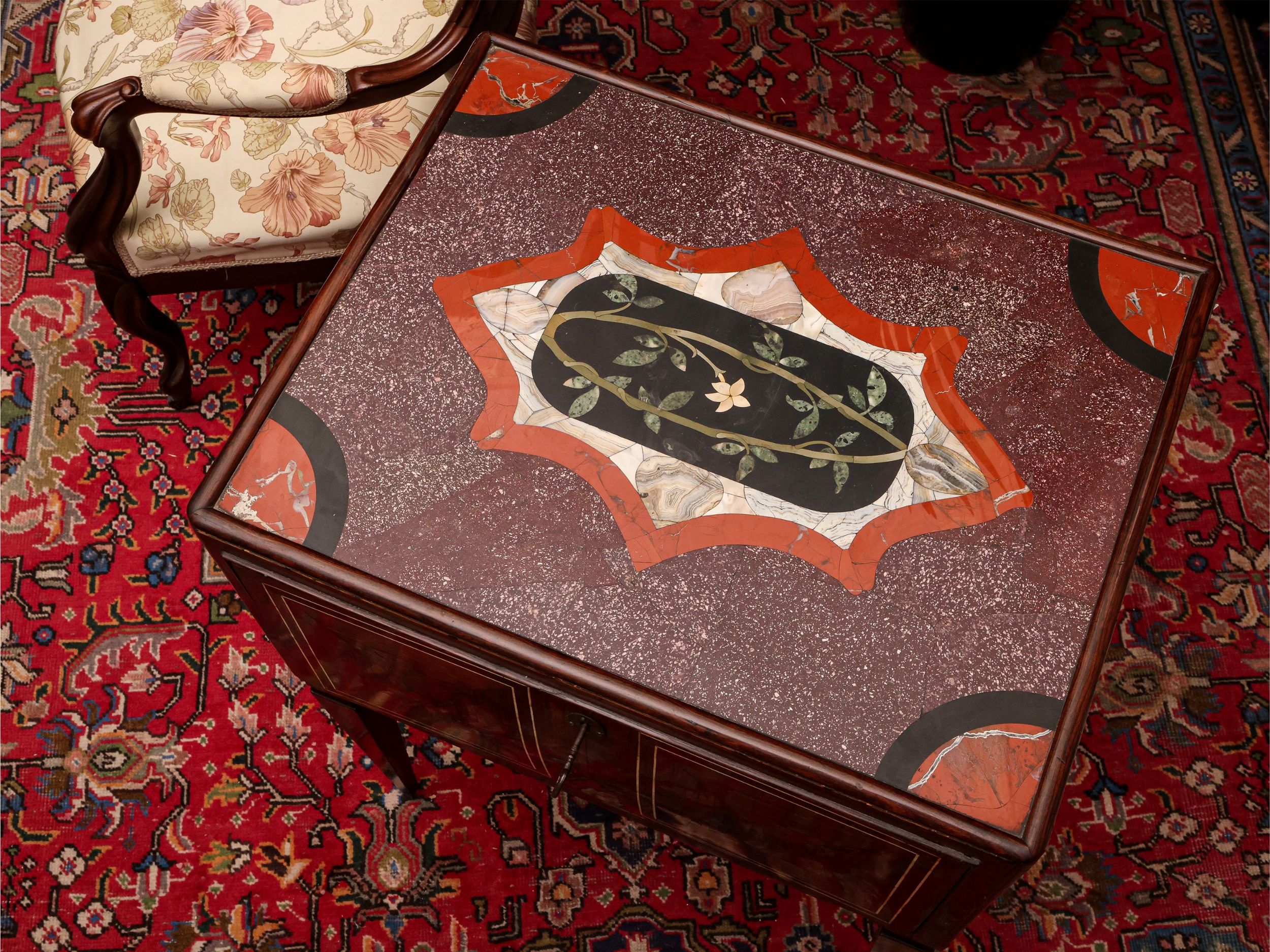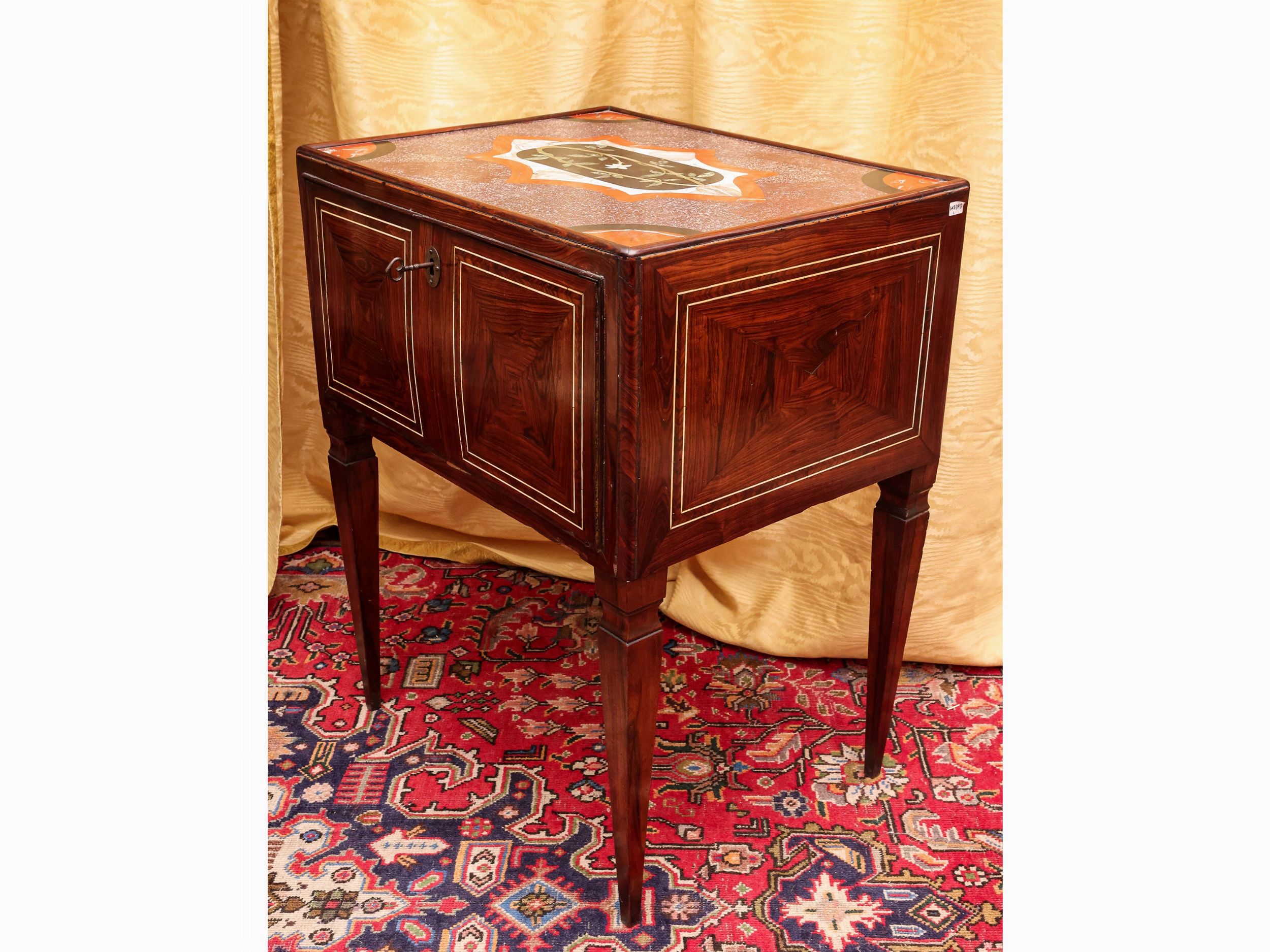 h cm 78x61x49 XVIII secolo fondo in porfido rosso con intarsi in marmo rosso e nero agli angoli e nel rosone centrale a ventaglio, al centro ovale con decorazione floreale probabilmente di epoca posteriore, montato come piano di un piccolo stipo impiallacciato ed intarsiato in palissandro, sportello a calatoio sul fronte dritto, gambe a faretra