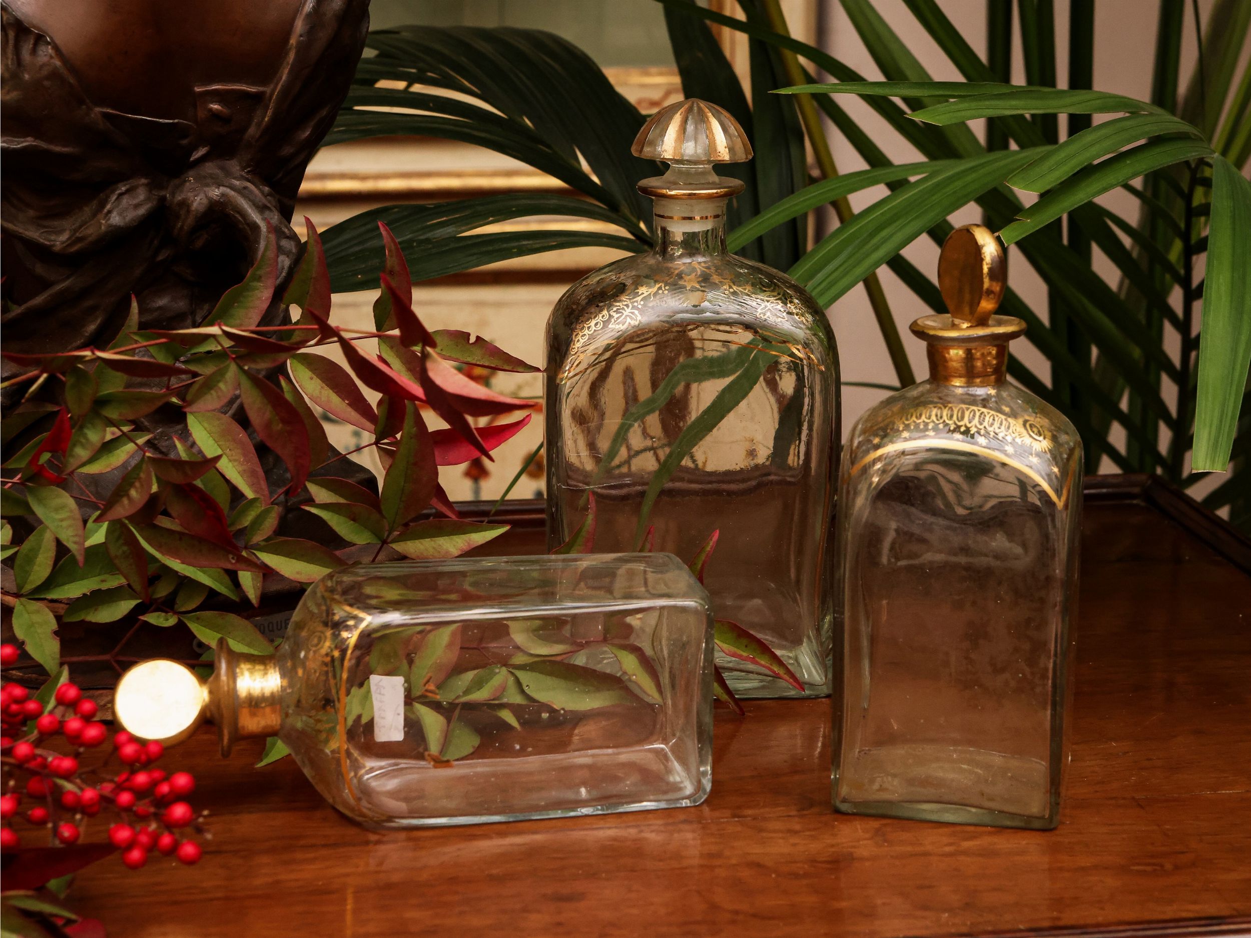 Serie di tre bottgilie da vino in vetro con lumeggiature dorate