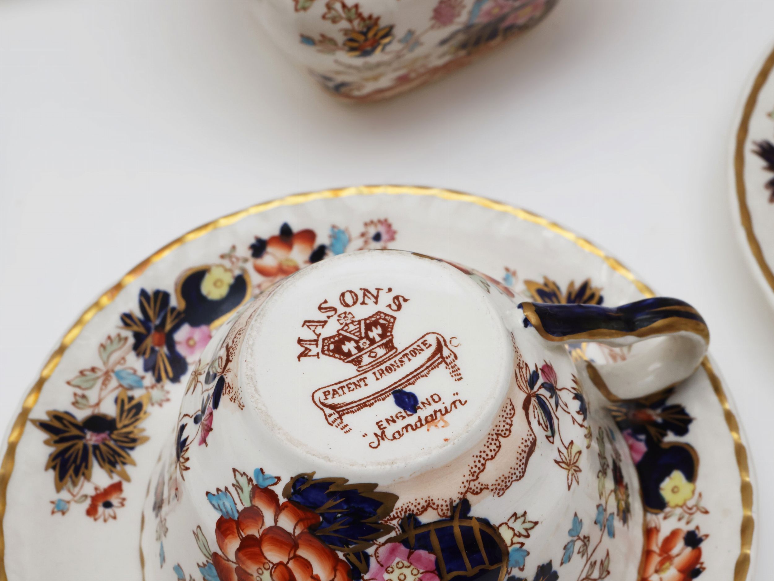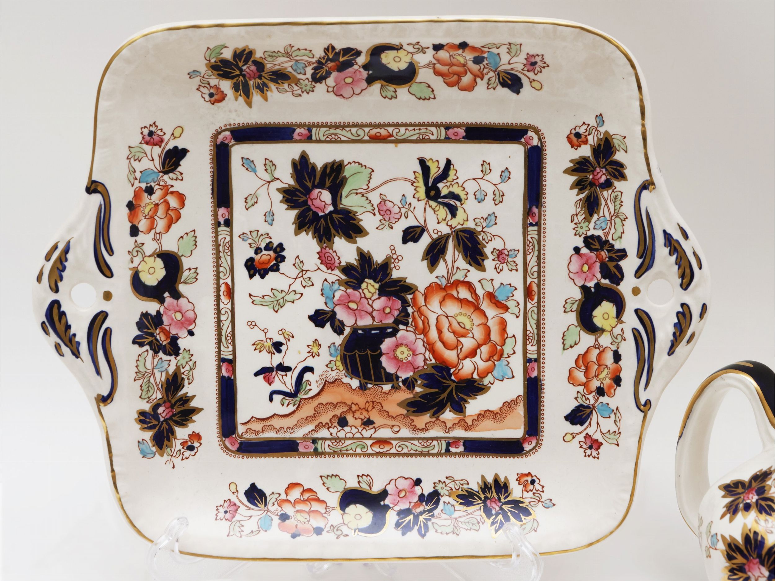 Inghilterra, XX secolo decorato con motivi floreali policromi e lumeggiature dorate, composto da teiera, zuccheriera, 8 tazze con 7 piattini ed un vassoio per pasticcini (10)