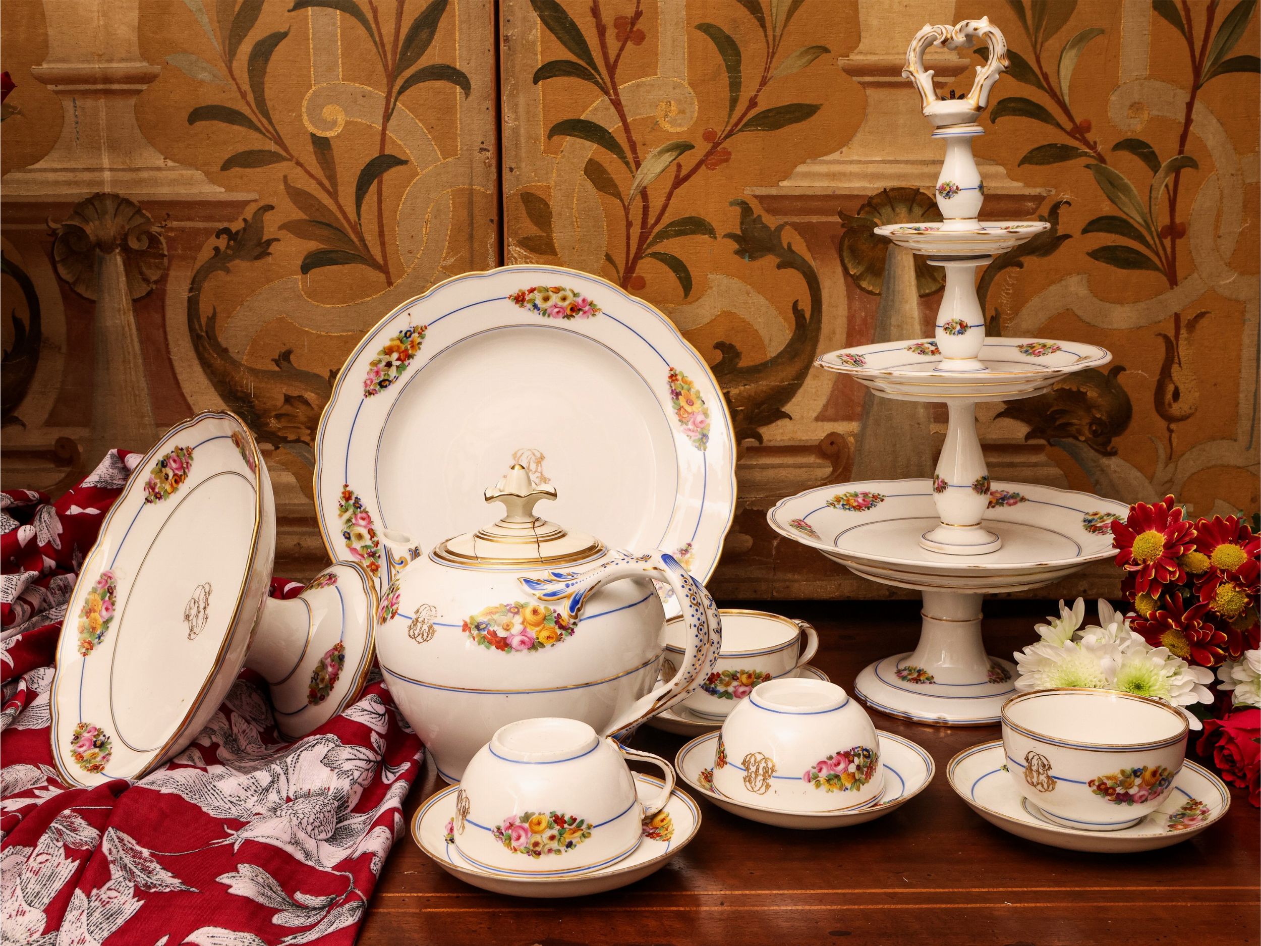 Francia, seconda metà del XIX secolo orlo polilobato lumeggiato in oro, tesa dipinta a bouquet fioriti policromi, cavetto centrato da monogramma, composto da 39 piatti piani, 12 piatti fondi, 2 grandi vassoi ovali a scalare, 3 vassoi da portata circolari, 3 antipastiere, zuppiera, salsiera, alzata, mostardiera, alzata per dessert, teiera e 12 tazze corredate di piattino, numerose sbeccature e difetti (75)