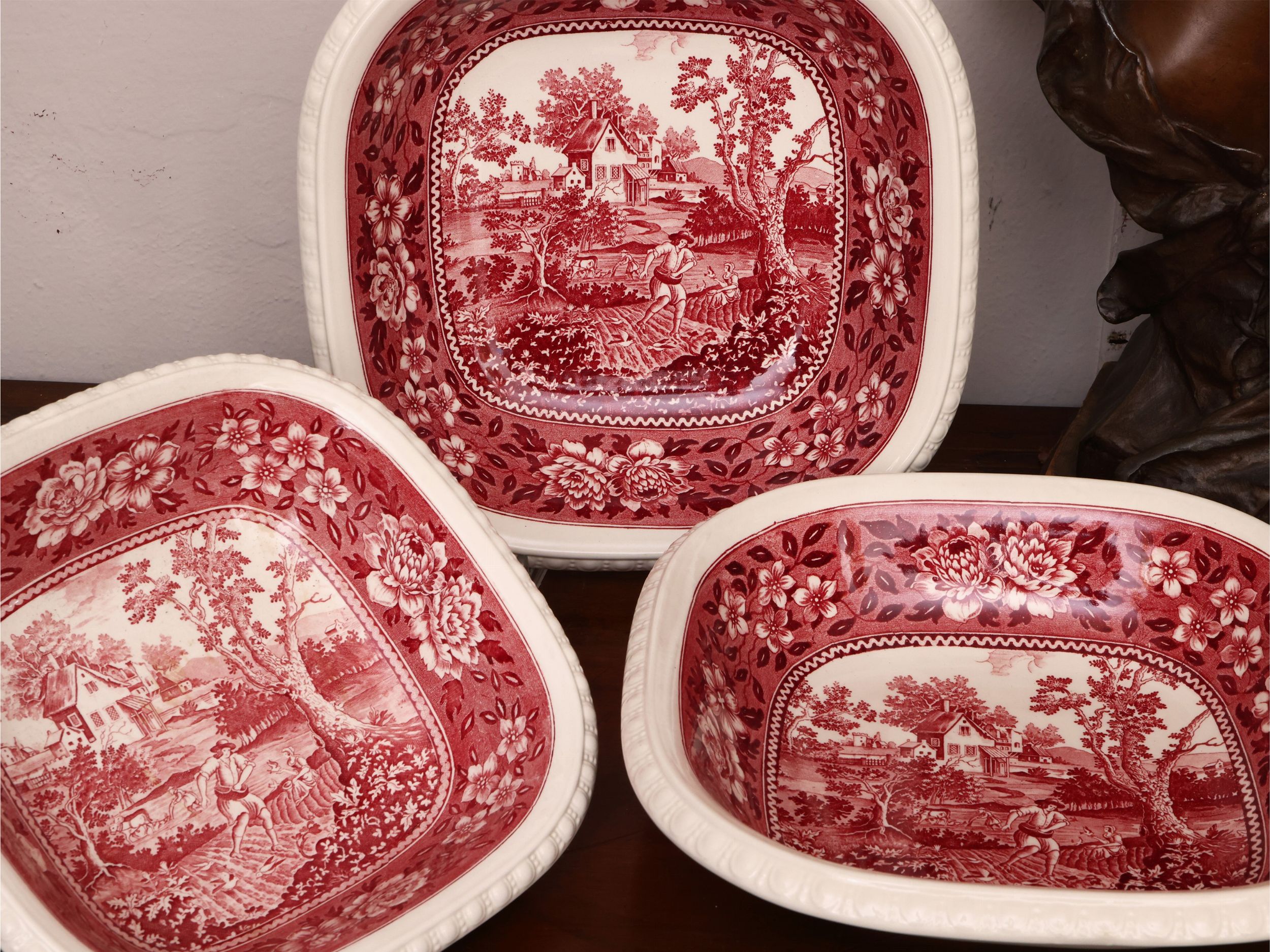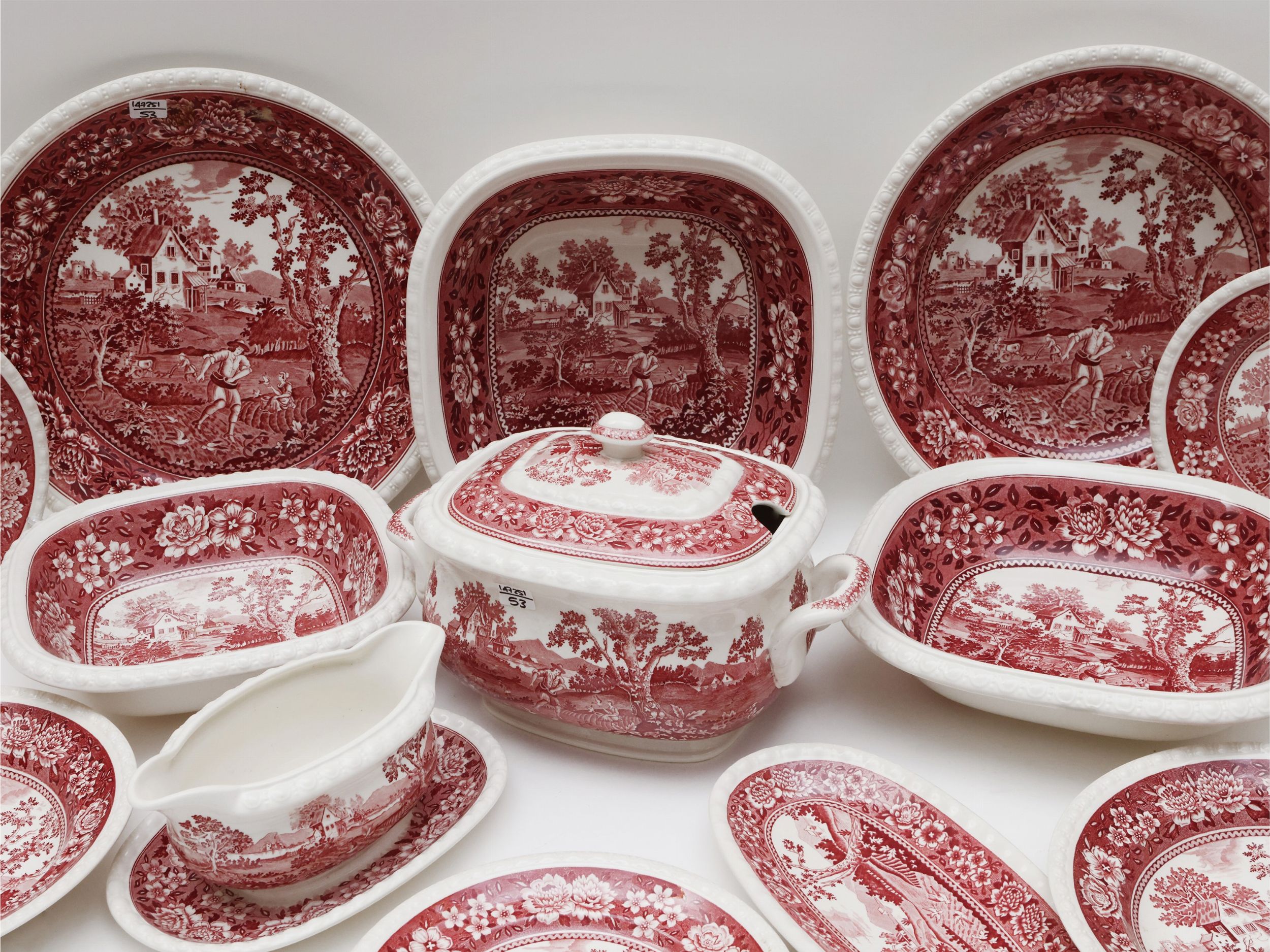 decorati in monocromia magenta a motivi floreali e paesaggi bucolici, orli percorsi da motivi baccellati, composto da 12 piatti fondi, 21 piatti piani, 12 da frutta, 2 vassoi circolari, salsiera, zuppiera, 3 insalatiere di cui una più piccola e antipastiera (53)
