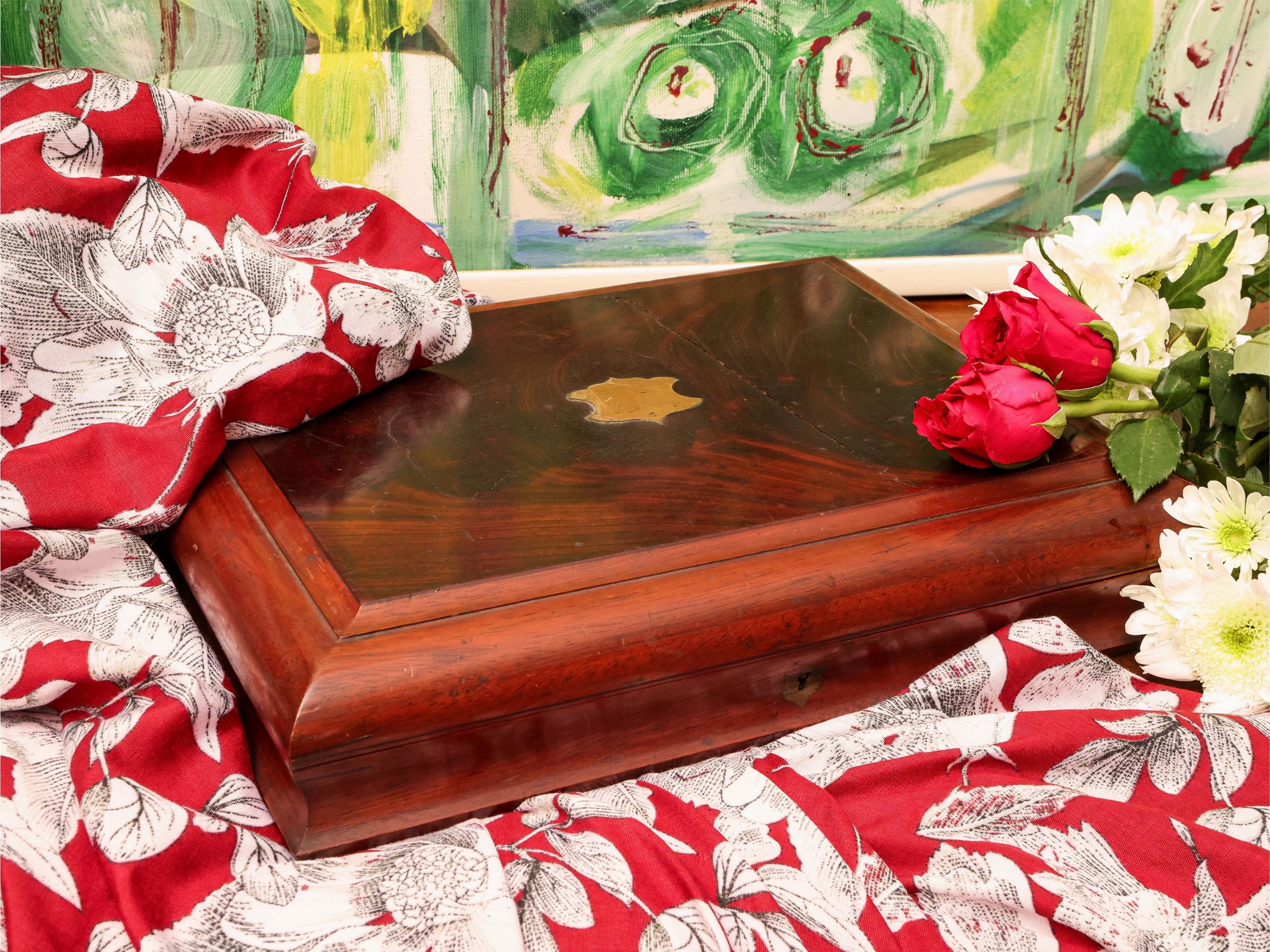cm 6,5x34x27 Sheffield 1874 composto da 10 forchette e 10 coltelli, entro cofanetto in mogano e piuma di mogano, centrato da intarsio metallico a scudetto, mancante di due forchette e due coltelli, difetti
