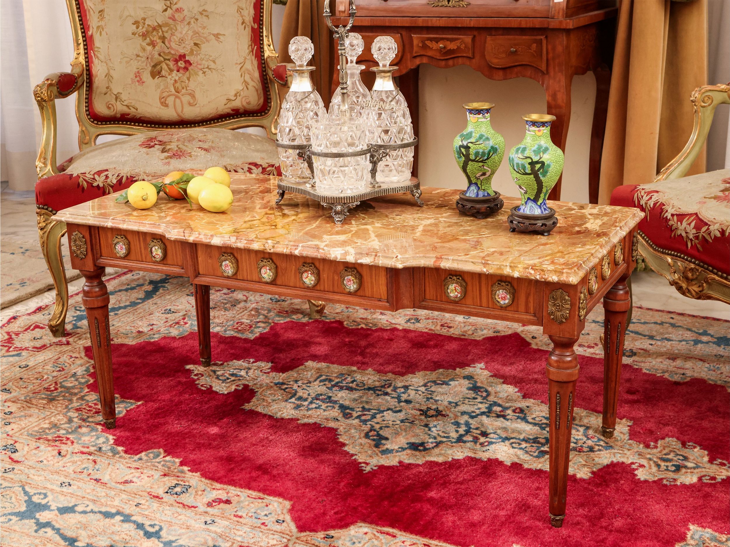 XX secolo di gusto neoclassico, piano in marmo, impreziosito da medaglioni in porcellana e bronzo dorato