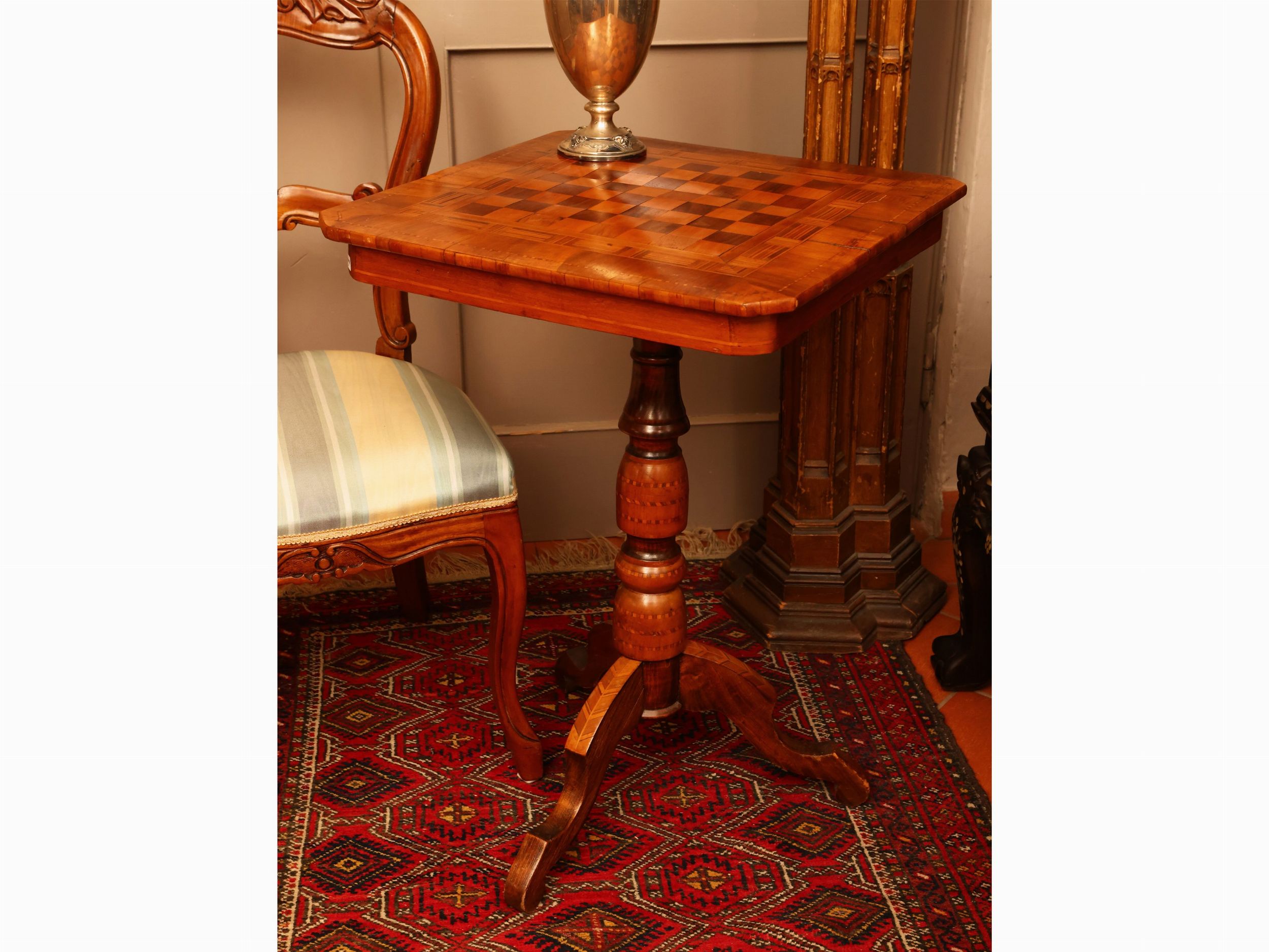 metà del XIX secolo intarsiato con motivi di scacchiera, su tripode, lievi difetti