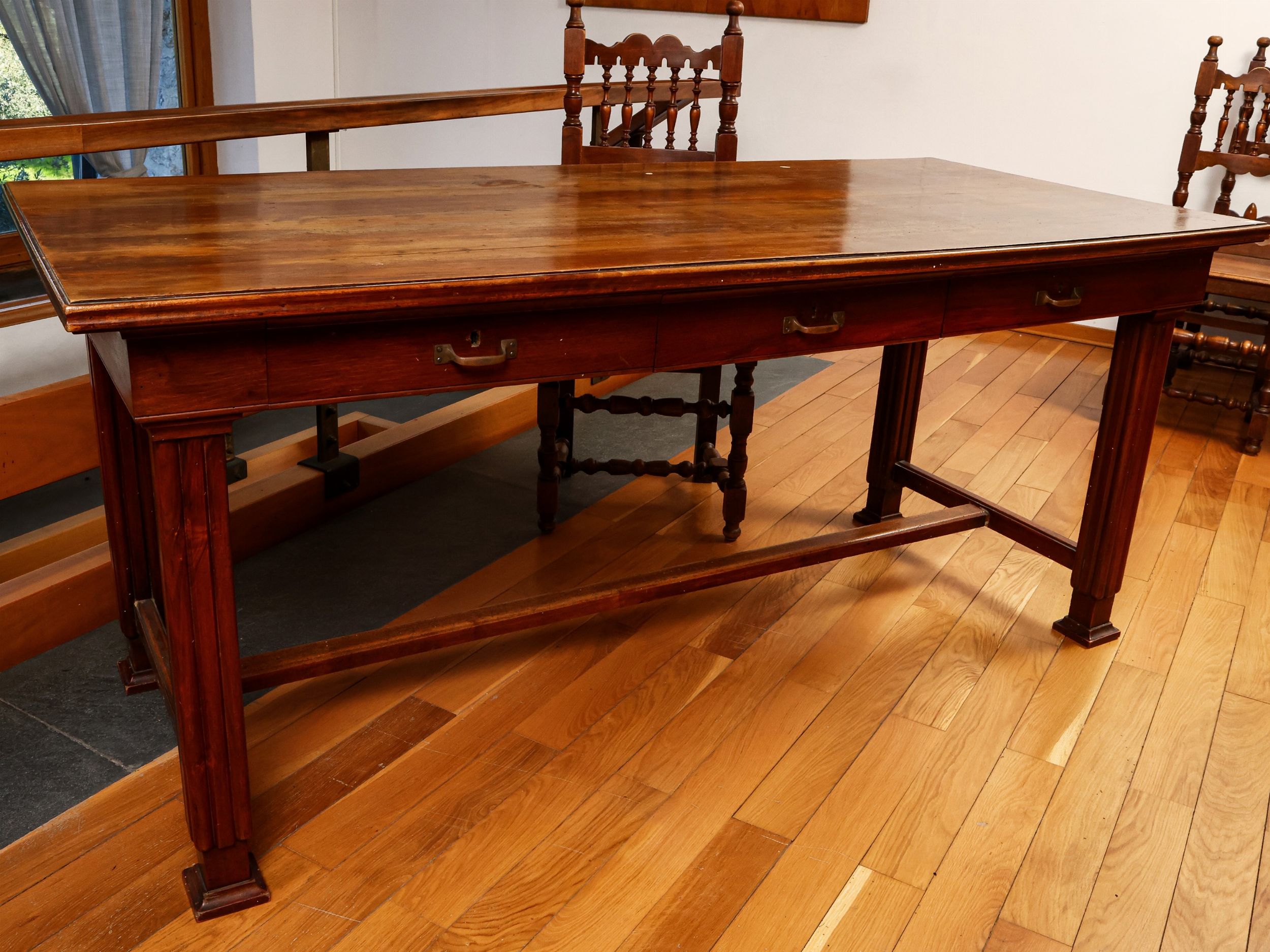 Anni Trenta tre cassetti nella fascia, gambe a colonna scanalate riunite da traversa ad H, difetti