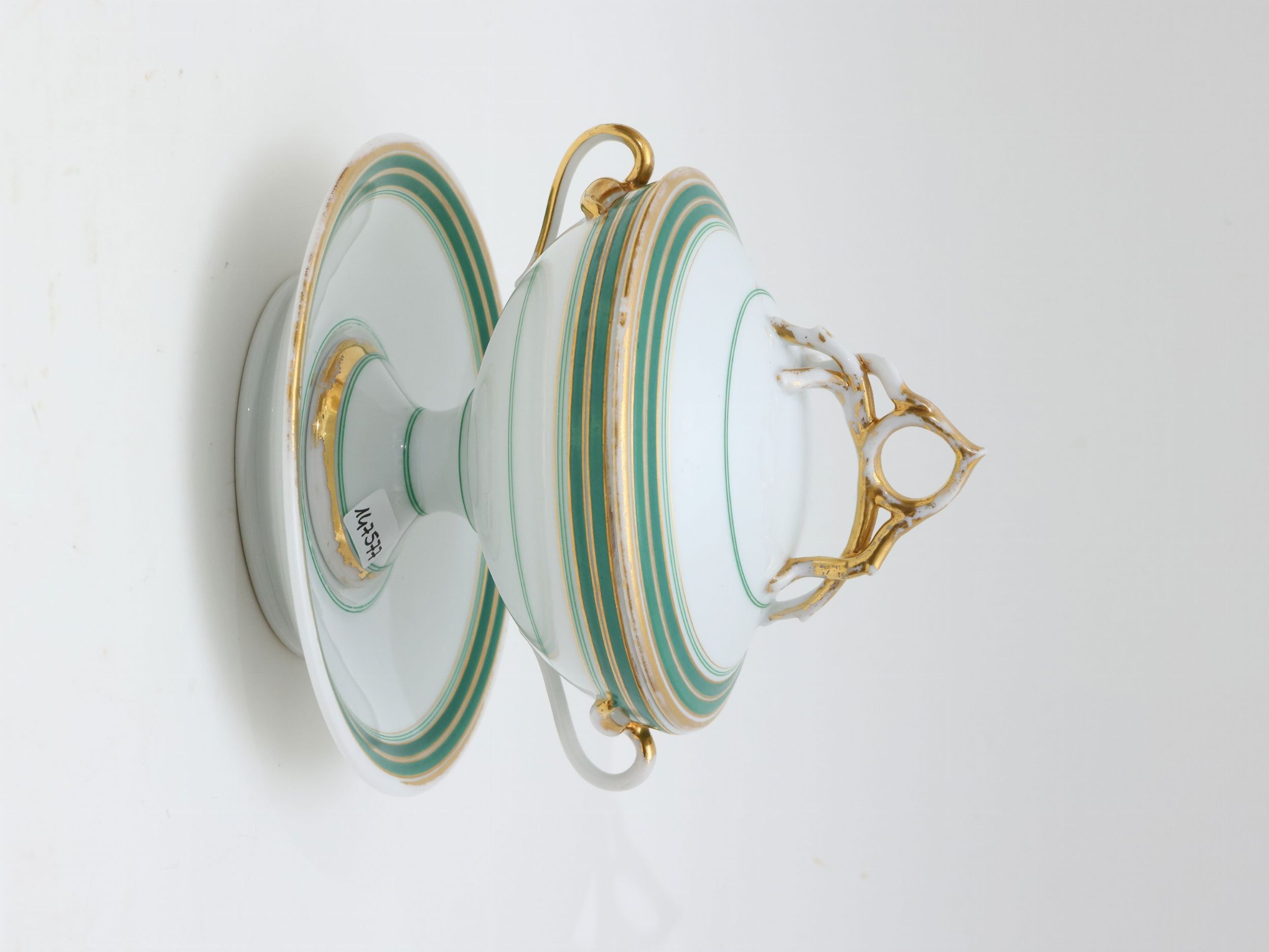 metà del XIX secolo dipinta cn filettature verdi e lumeggiate in oro, completa di piatto e coperchio, lievi difetti