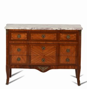 Comò impiallacciato ed intarsiato in varie essenze, Francia XIX secolo