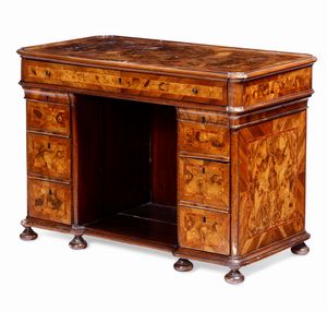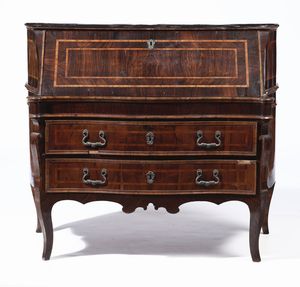 Piccola ribaltina a tre cassetti in legno intarsiato, XVIII-XIX secolo