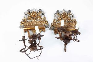 Coppia di antiche appliques in legno intagliato, dorato e dipinto