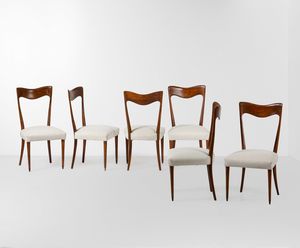 Sei sedie con struttura in legno e rivestimenti in tessuto.
