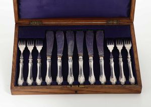 Servizio di posate da pesce in metallo argentato, entro scatola in legno. XIX-XX [..]