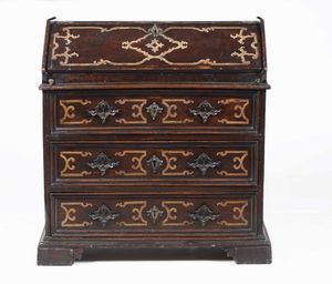 Piccola ribaltina a tre cassetti in legno intarsiato, XVIII-XIX secolo