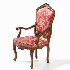 Poltrona in legno intagliato, schienale e seduta rivestiti con tessuto a piccolo [..]