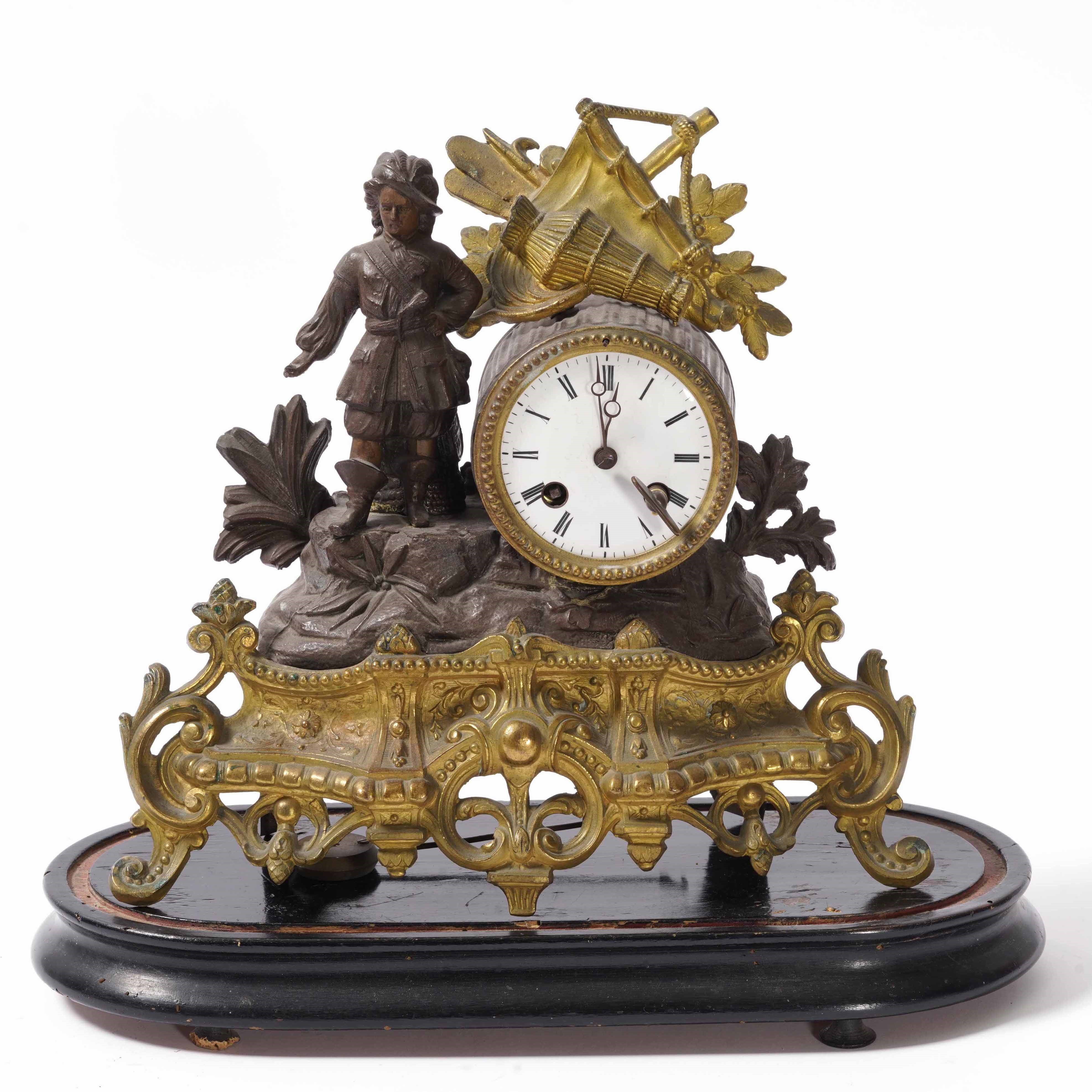 Pendola da tavolo in metallo dorato e patinato.