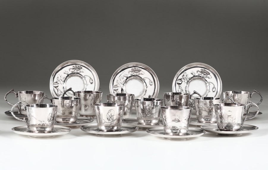 Servizio di 12 tazzine da caffè e 12 piattini in metallo argentato, firmate Orfevreire [..]