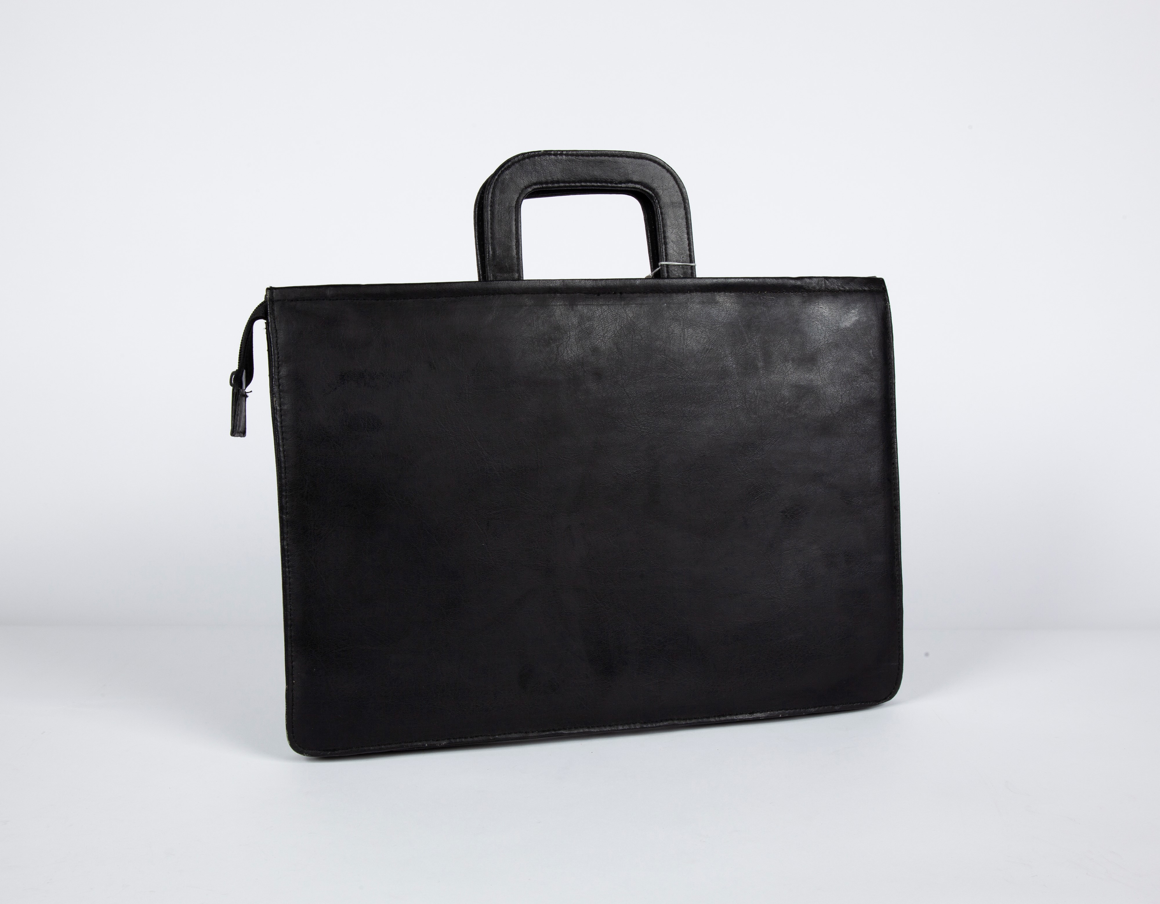 Con doppio manico, chiusura con cerniera; due scomparti interni e uno laterale con cerniera. Interno rivestito in tessuto.