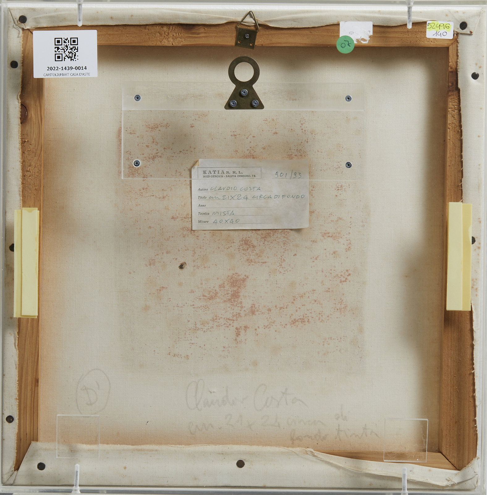 Firma e titolo in basso a matita. Al retro cartiglio descrittivo Galleria Katia srl, Genova. Entro teca in plexiglass. Opera in corso di archiviazione presso l'Archivio Claudio Costa. Difetti.