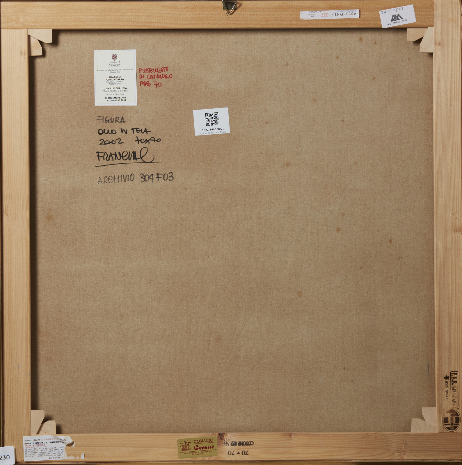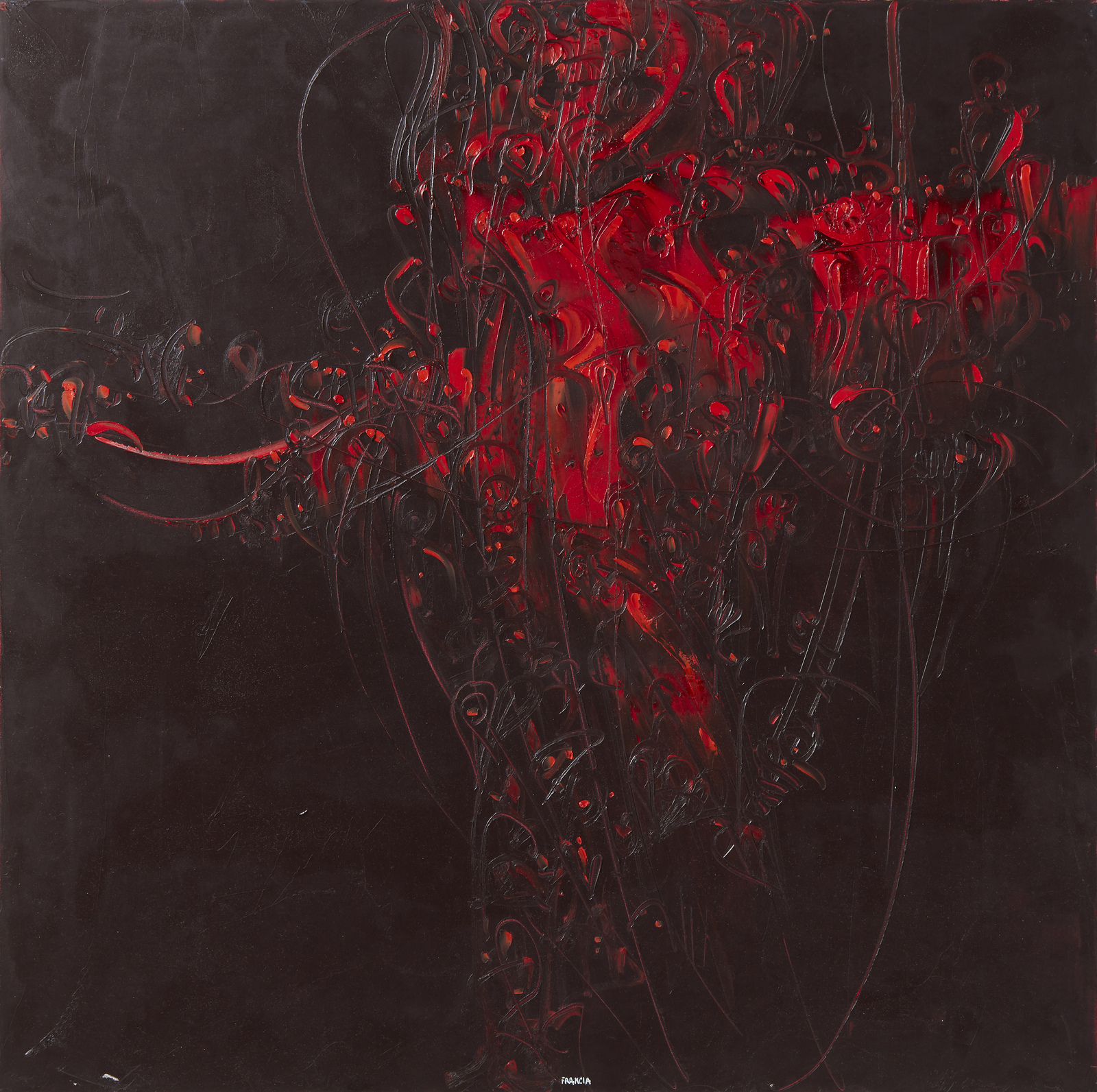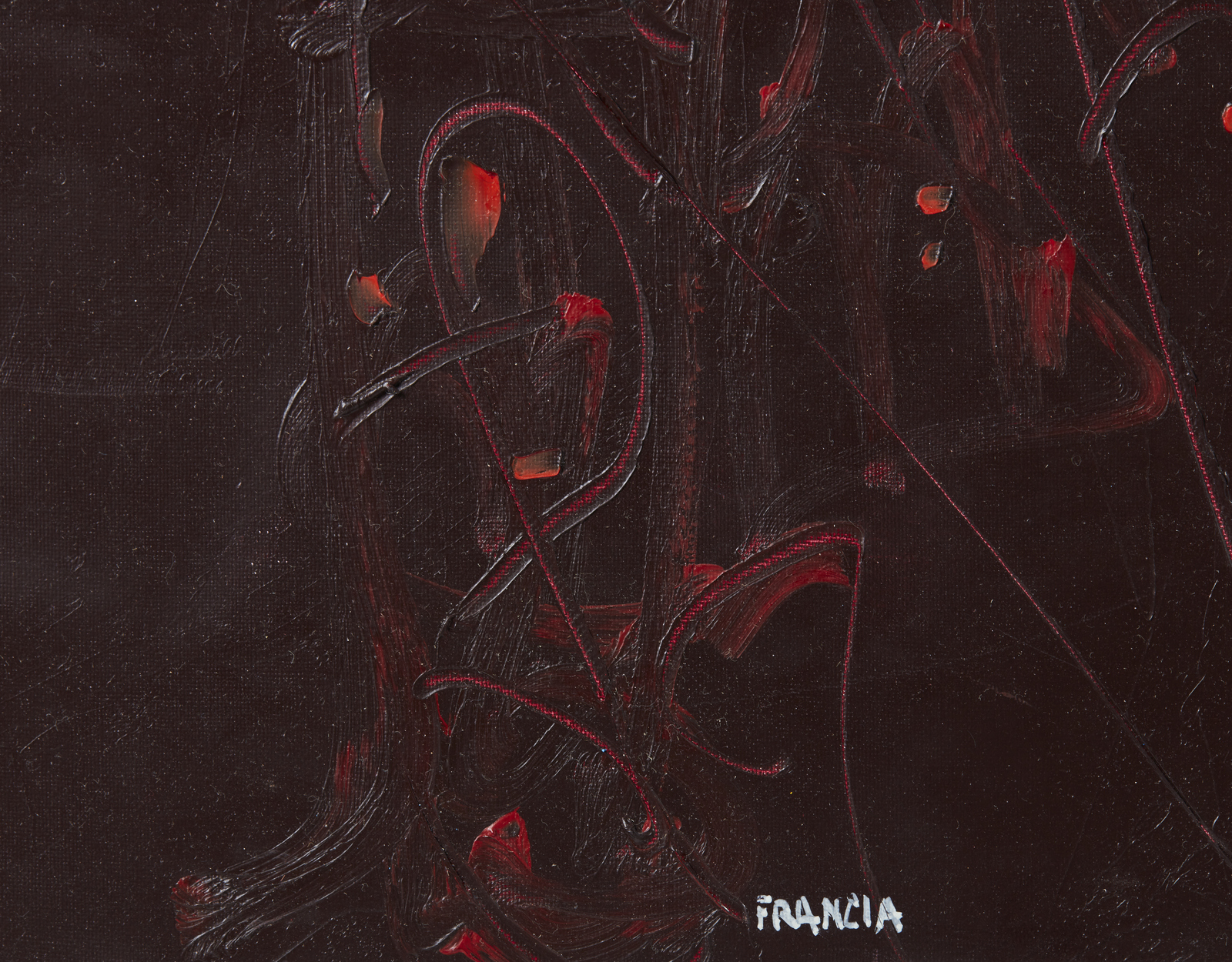 Firma in basso al centro. Al retro titolo, firma, anno, cartiglio della mostra Camillo Francia. Tra il rosso e il nero. Autentica su fotografia dell'artista. Certificato di provenienza e garanzia Meeting Art, Vercelli. Esposizioni: Camillo Francia tra il rosso e il nero, Galleria Carlo Carrà, Palazzo Guasco, Alessandria, 20 dicembre 2003 -18 gennaio 2004. Lievi difetti.