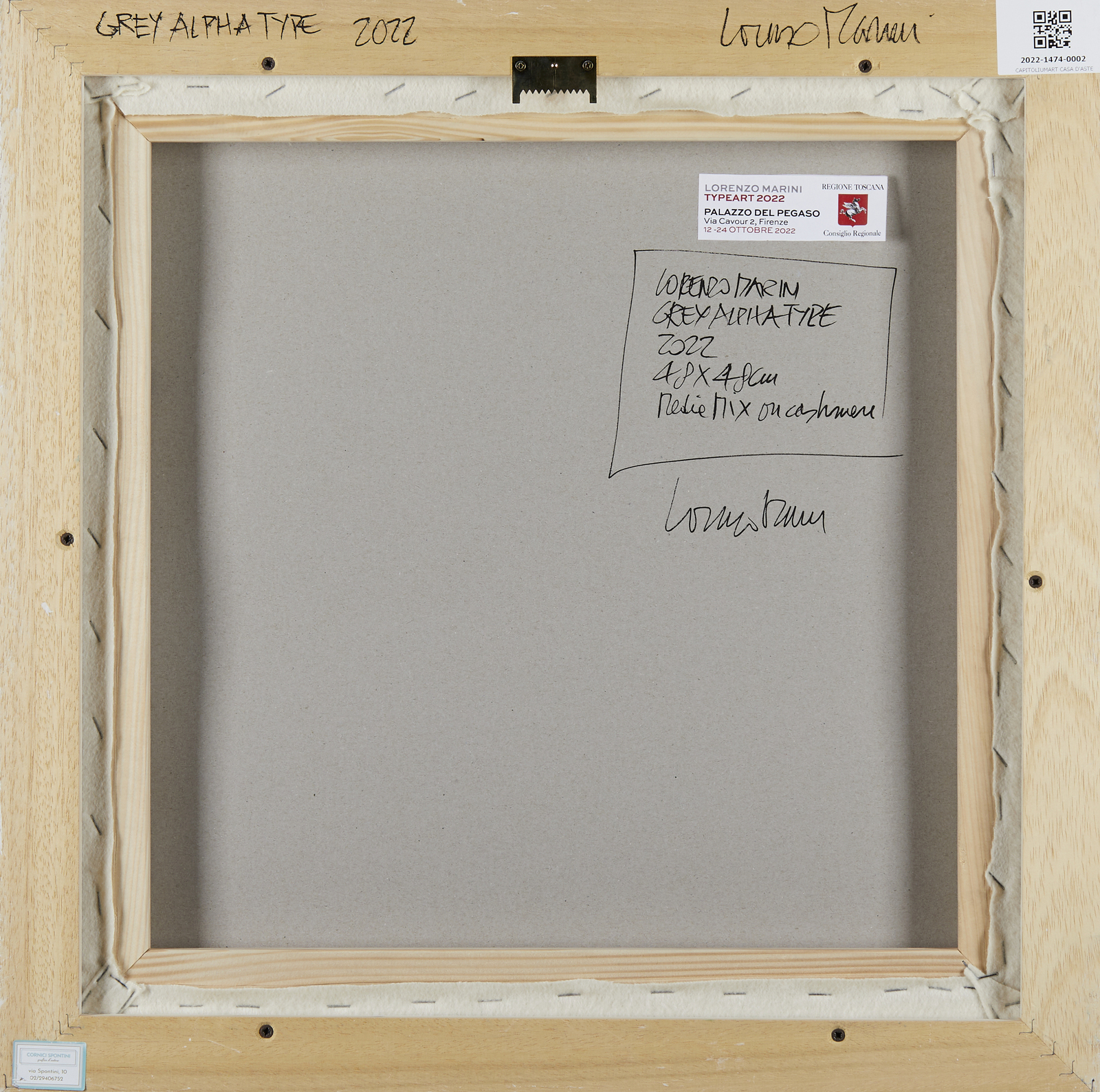 Al retro titolo, firma, anno e cartiglio Lorenzo Marini, Typeart 2022, Palazzo del Pegaso, Firenze, 12-24 ottobre 2022. Esposizioni: Lorenzo Marini, Typeart 2022, Palazzo del Pegaso, Firenze, 12-24 ottobre 2022. L'opera è stata realizzata su un supporto di cachemire. Opera archiviata presso Lorenzo Marini Arte come da documentazione allegata all'opera riportante il relativo numero d'inventario.
