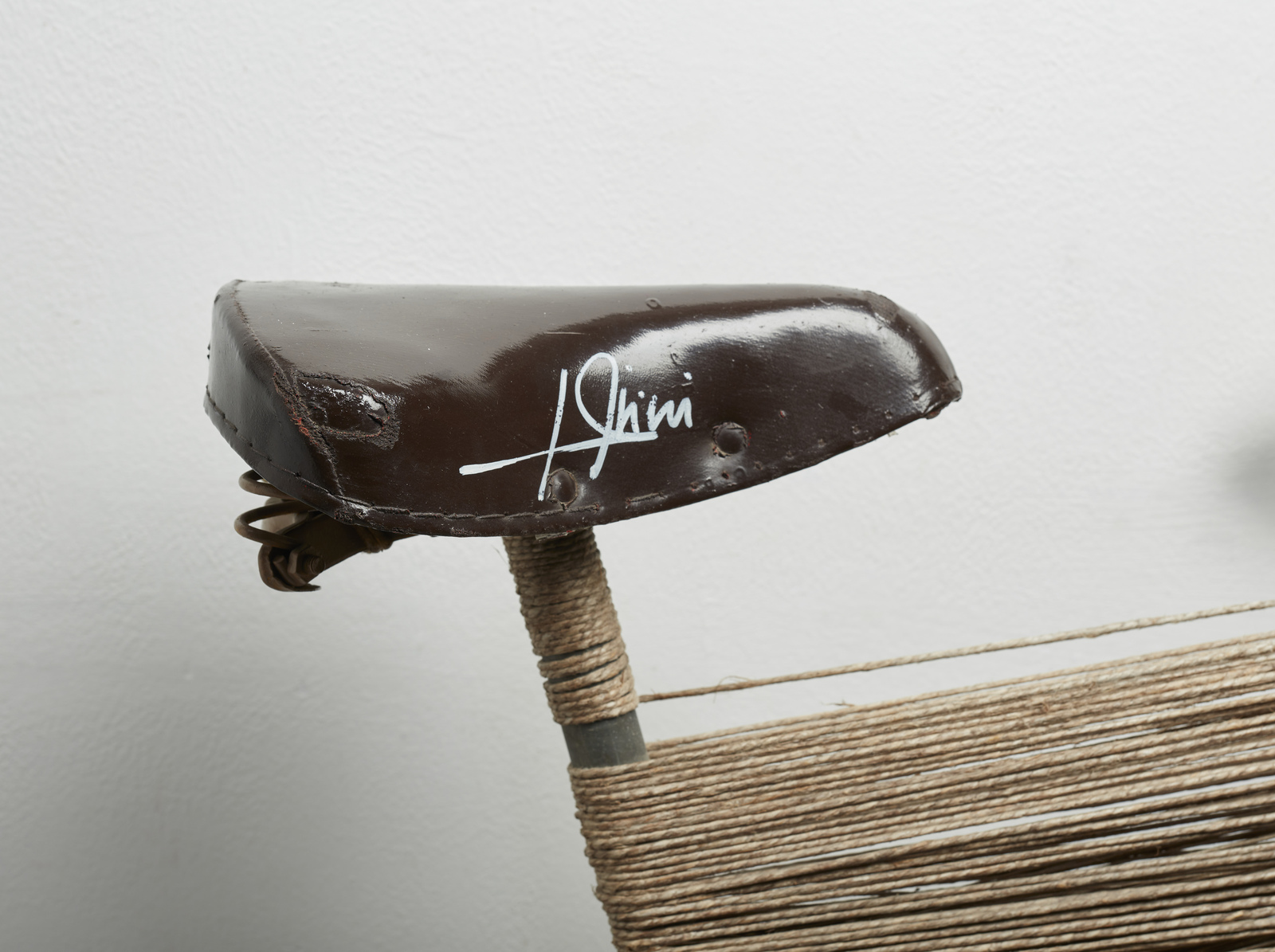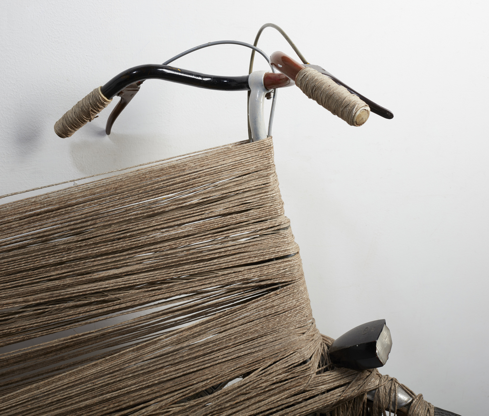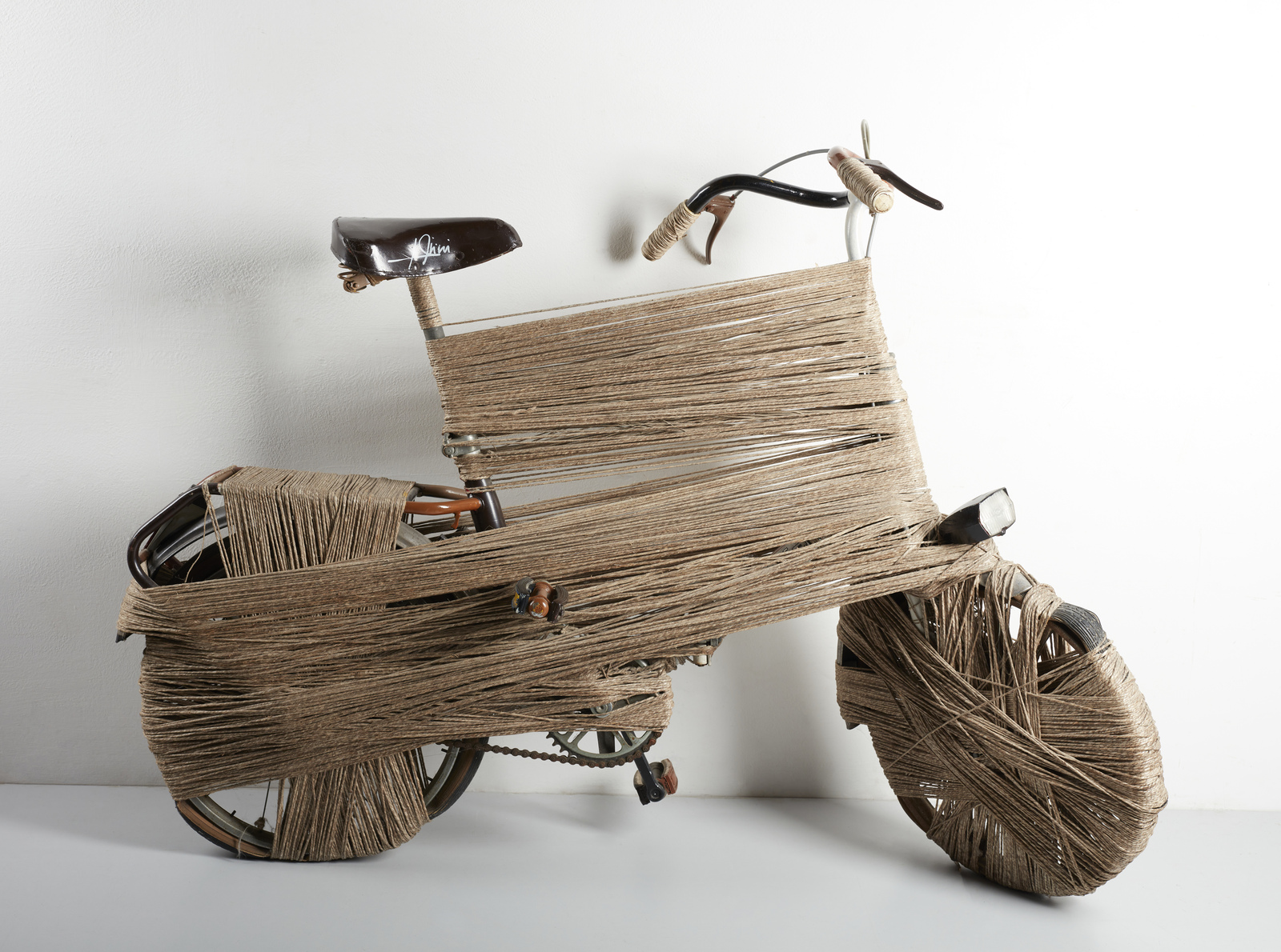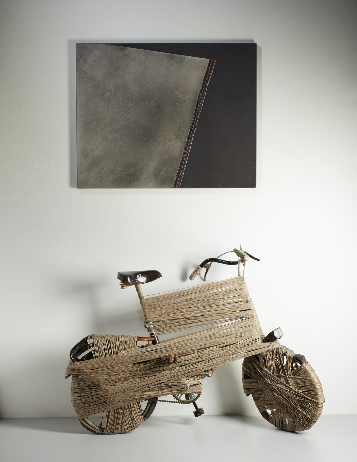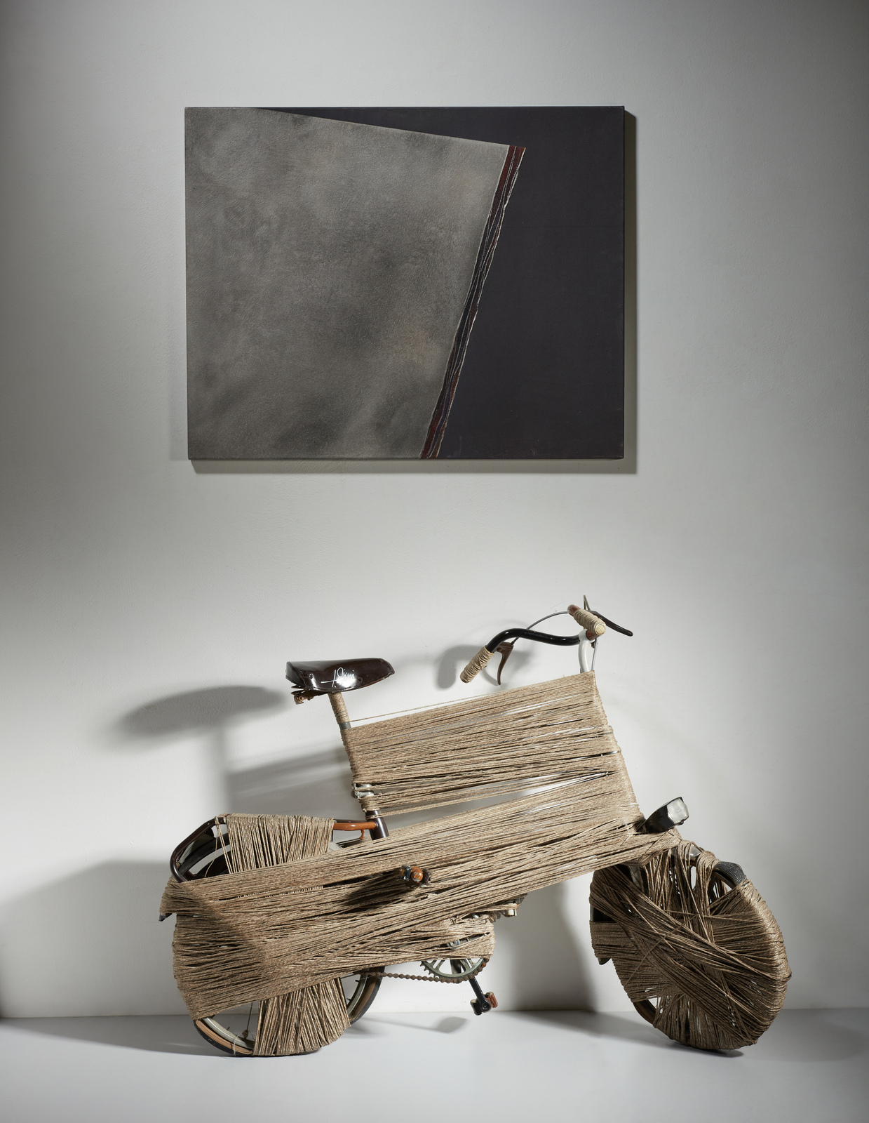 Il lotto è composto da due elementi: Olio su tela, 80x100 cm. Al retro firma. Bicicletta legata con corda, 100x130 cm. Firma sul sellino. Certificato di provenienza rilasciato da Casa d'Aste Semenzato, Venezia. Pubblicazione: Mascelloni Enrico, Il fascino dell'oggetto, Dopotutto Centro Culturale, Prato, Marzo-Maggio 1996, tav. 29. Lievi difetti.