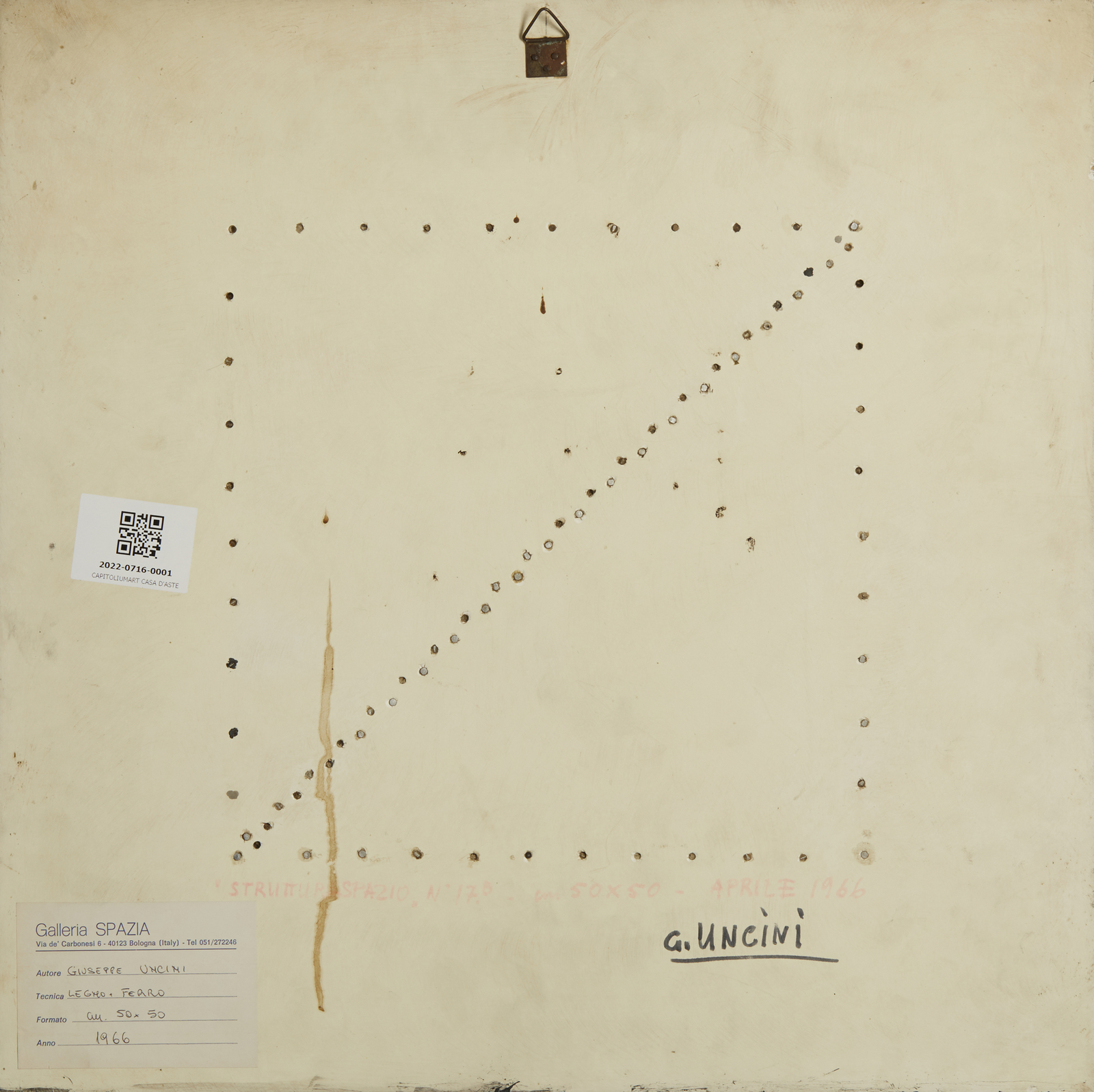 Al retro titolo, firma, anno e cartiglio descrittivo Galleria Spazia, Bologna. Si ringrazia la Galleria Spazia, Bologna, per aver confermato la provenienza dell'opera. Provenienza: Galleria Spazia, Bologna. Collezione privata, Bologna. Opera in fase di archiviazione presso l'Archivio Giuseppe Uncini.