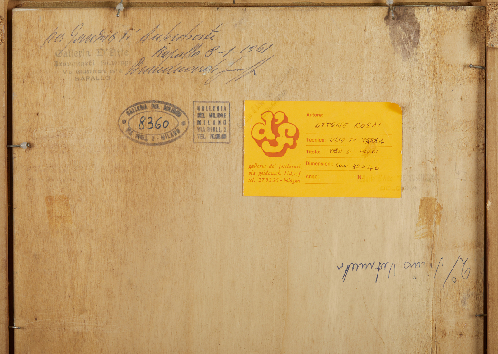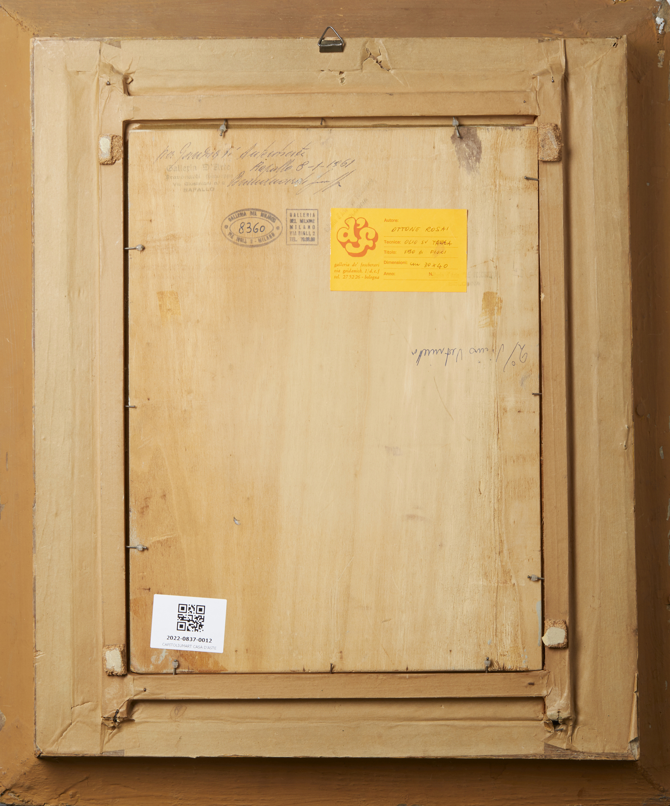 Firma in basso a destra. Al retro timbro Galleria del Milione, Milano. timbro Galleria d'arte Branduardi Giuseppe, Rapallo e cartiglio descrittivo Galleria De'Foscherari, Bologna. Provenienza: Galleria del Milione, Milano. Galleria Branduardi Giuseppe, Rapallo. Galleria De' Foscherari, Bologna. Collezione privata, Modena. Opera archiviata presso l'Archivio Ottone Rosai a cura del Prof. Giovanni Faccenda. Lievi difetti.