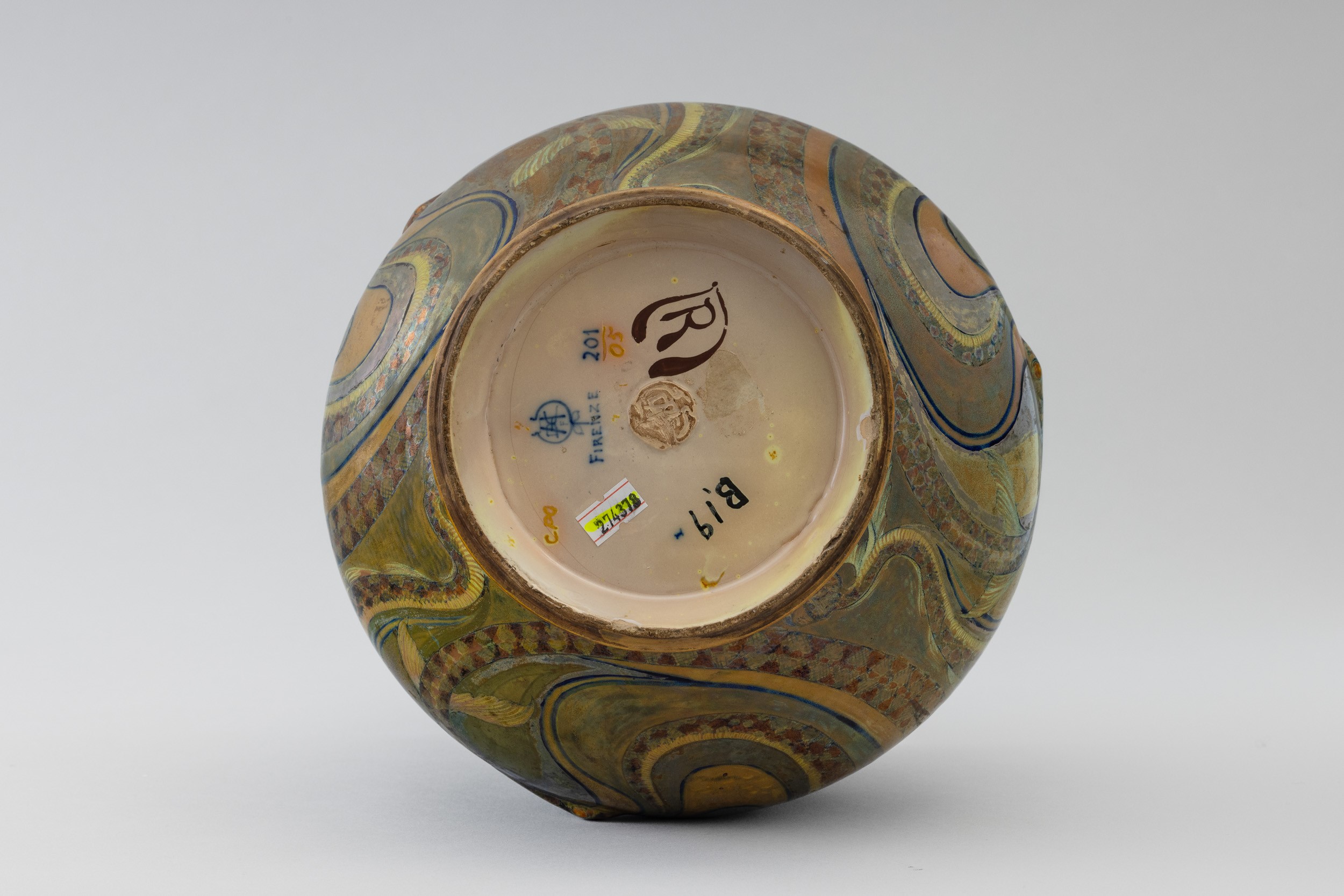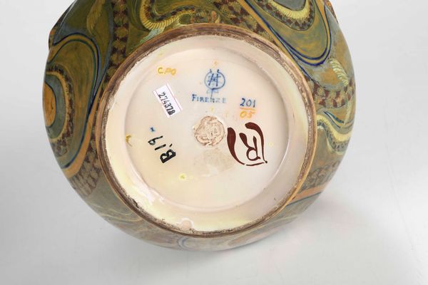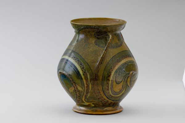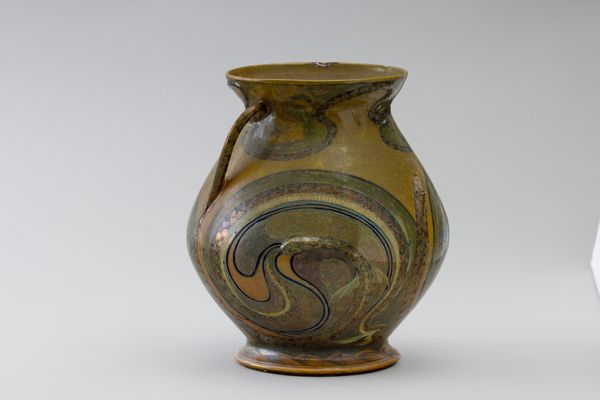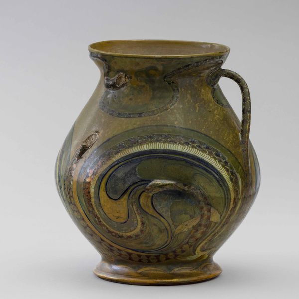 Raro vaso in ceramica con anse applicate in forma di serpenti e decoro di lustri metallici.