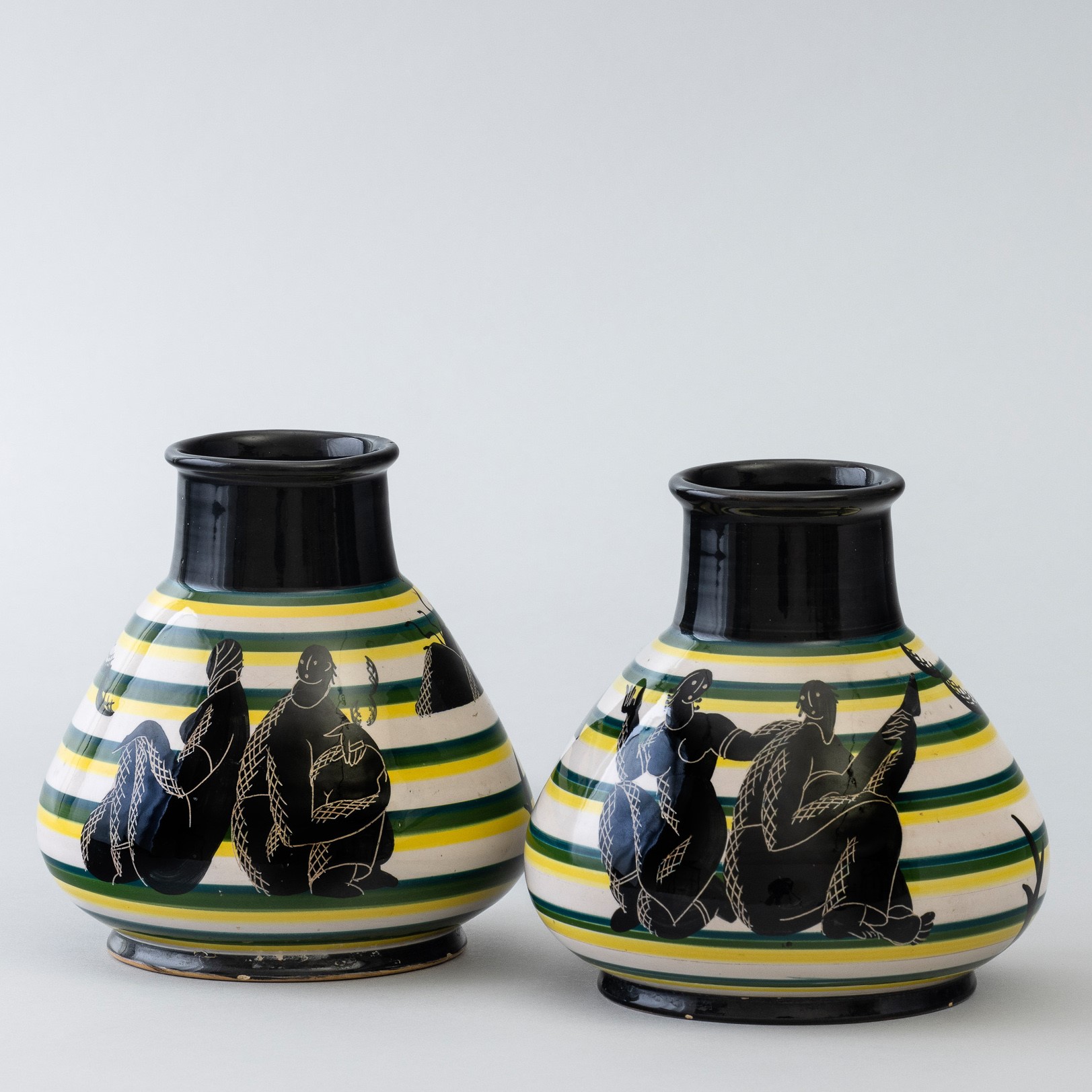 Coppia di vasi troncoconici in terraglia a colaggio con decoro di figure nere su fondo a fasce policrome.