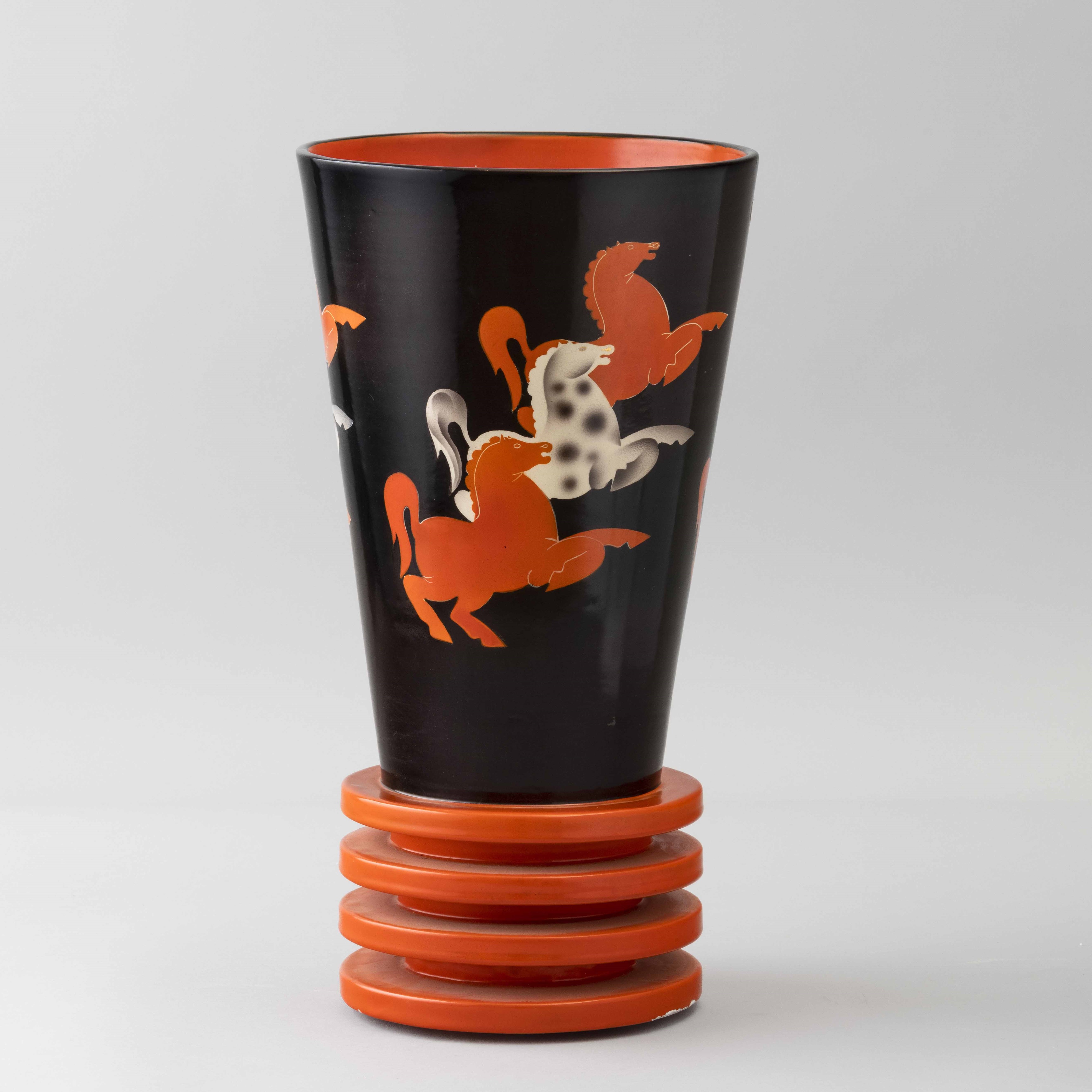 Vaso troncoconico con base circolare ad anelli in ceramica con decoro policromo all'aerografo di cavalli stilizzati.