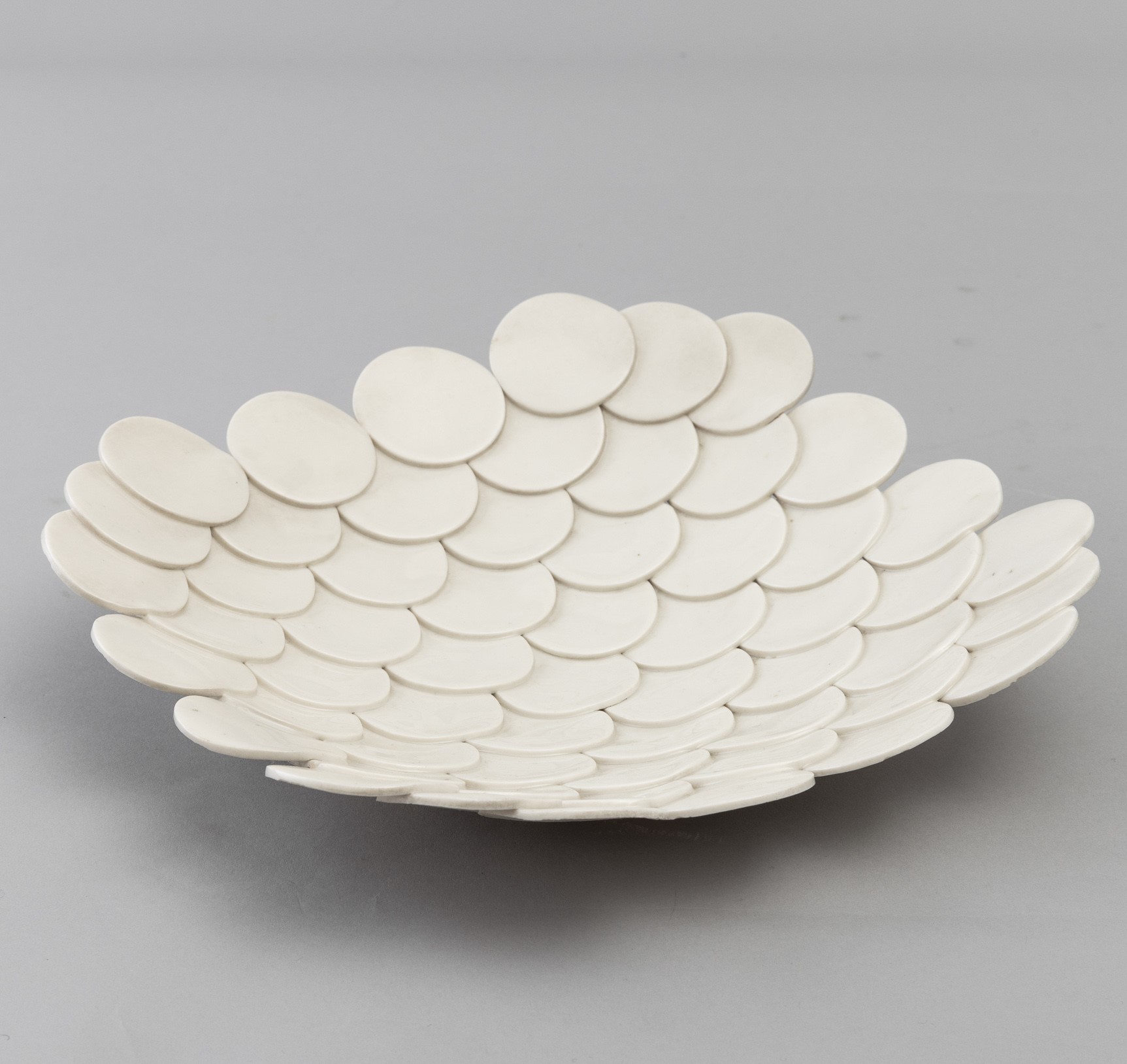 Coppa quadrata serie Samos in porcellana formata da elementi circolari disposti a squame.