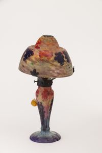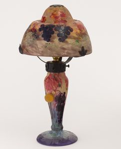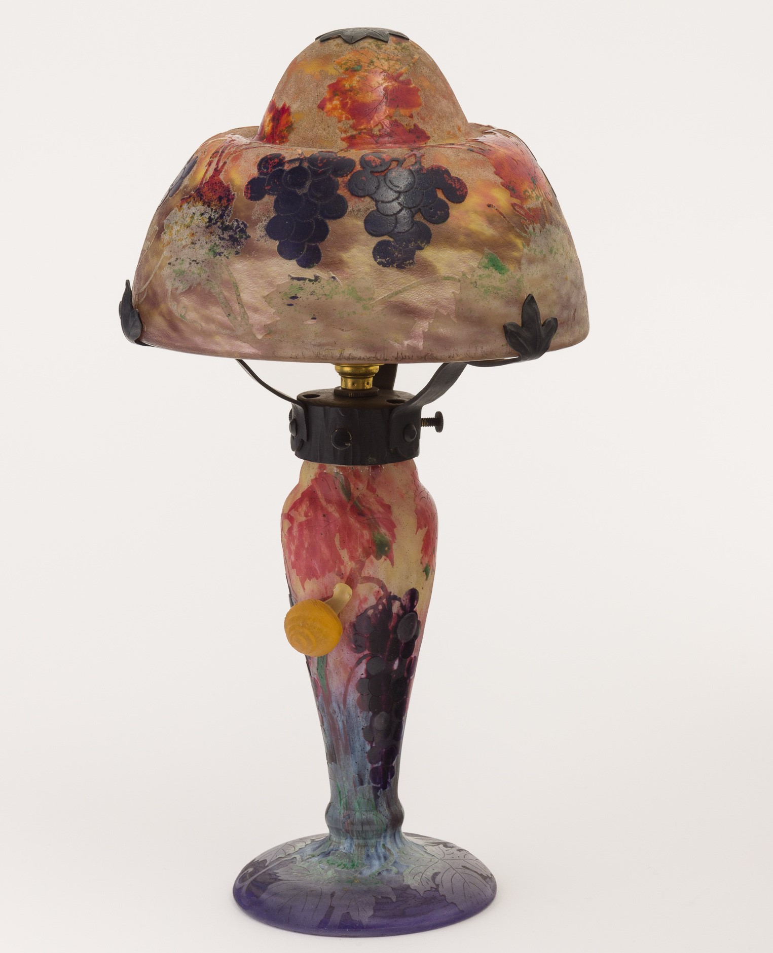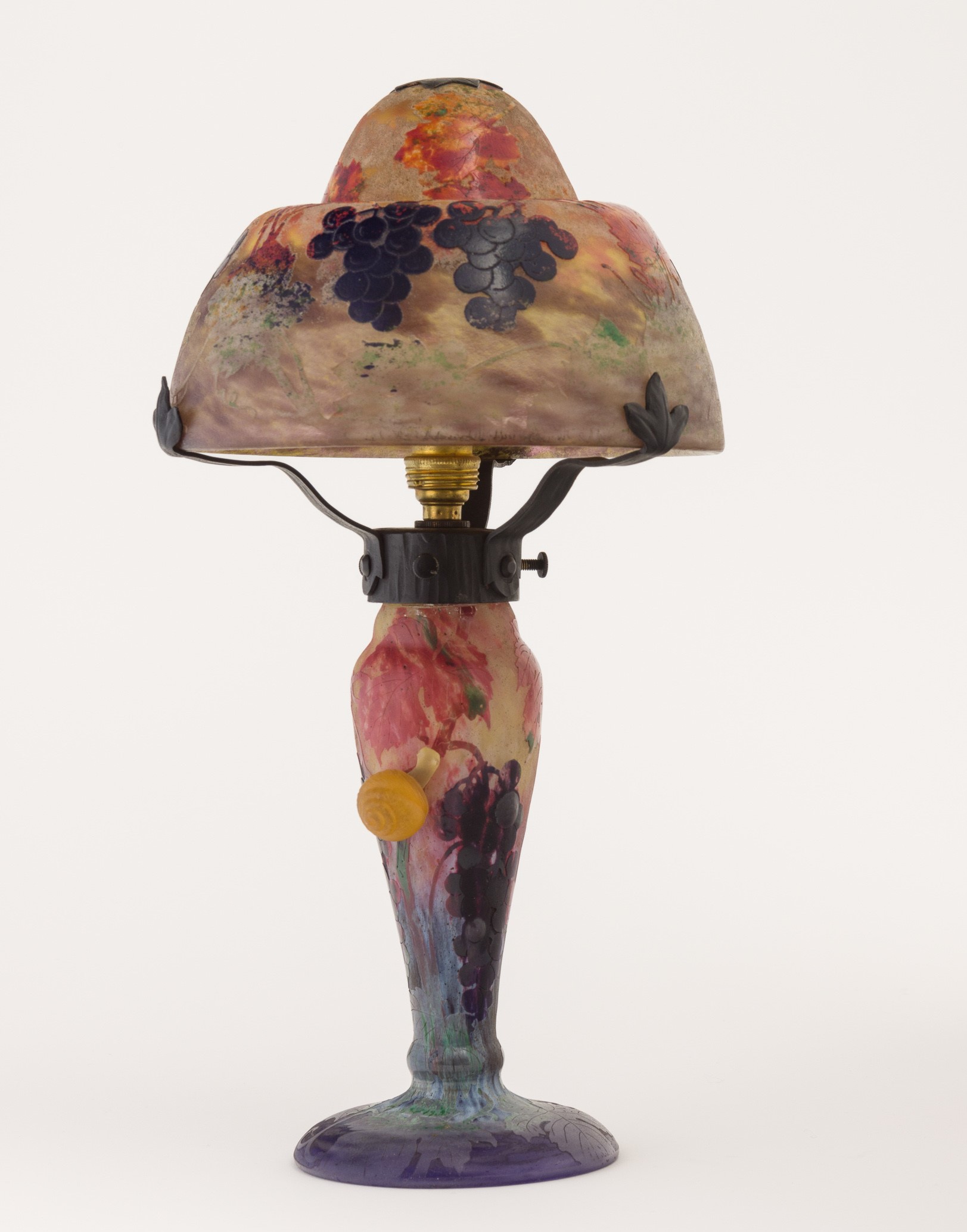 Rara lampada in vetro a cammeo con decoro di tralci d’uva e chiocciola in pasta vitrea applicata modellata a caldo.