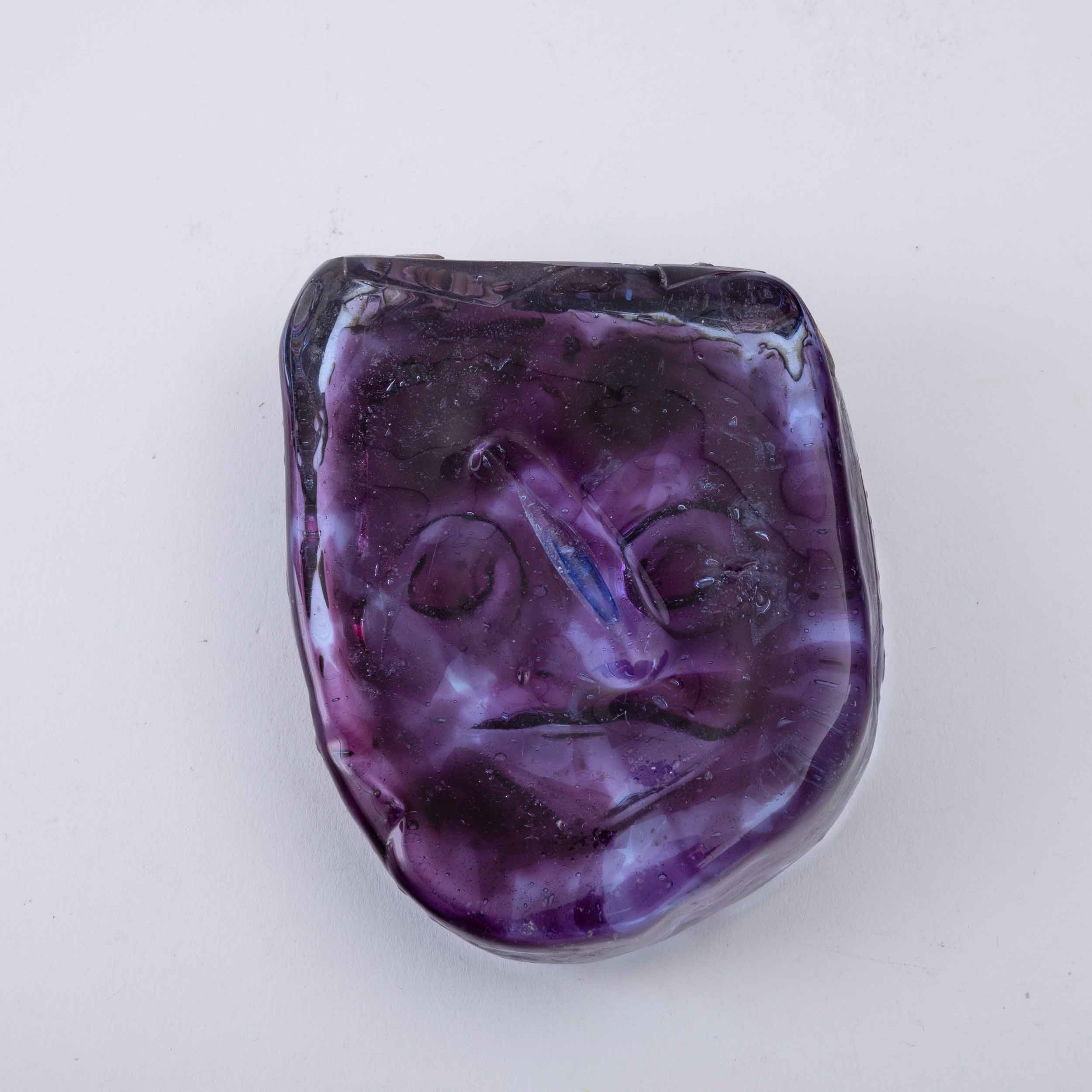 Piccola piastra ametista in vetro raffigurante volto impresso nella materia. Decoro di polveri colorate sommerse.