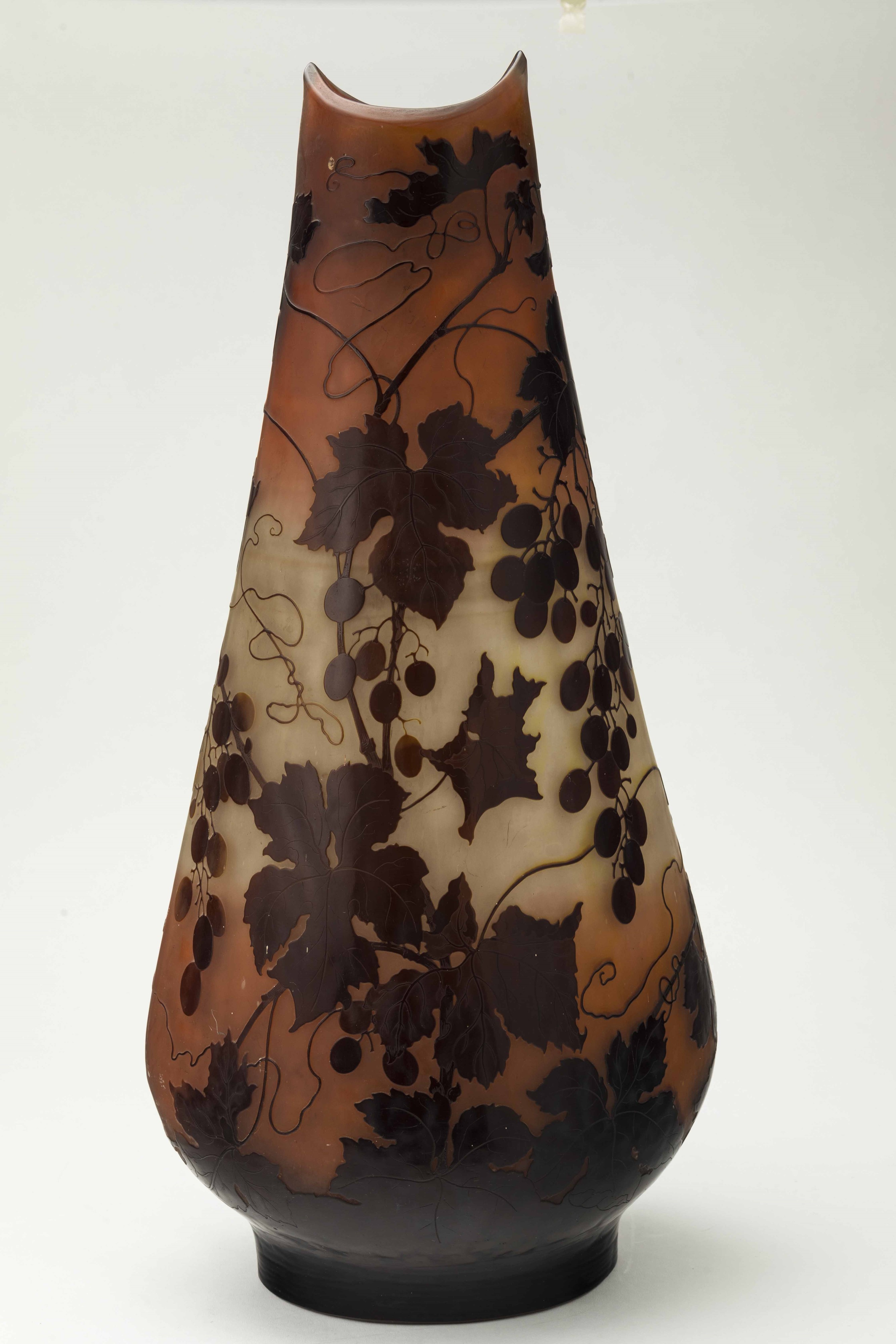 Grande vaso a goccia a sezione ovale in vetro a cammeo con decoro di rami di bacche.