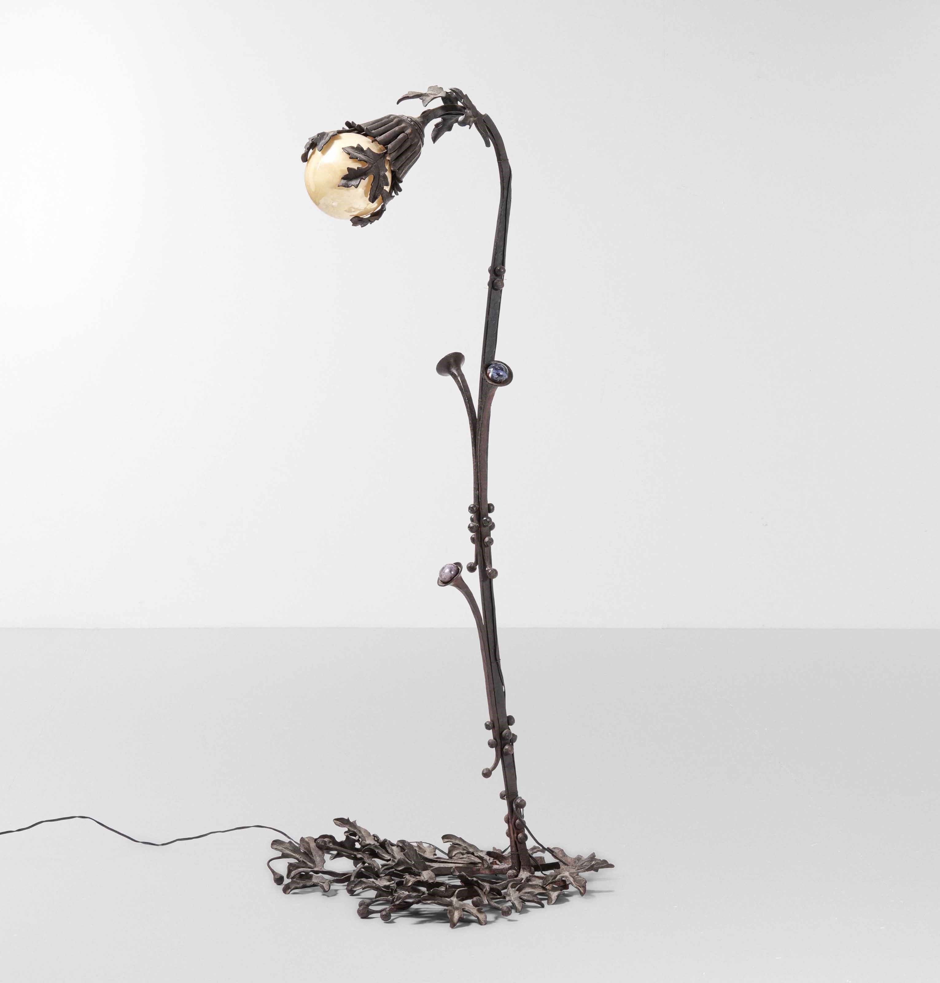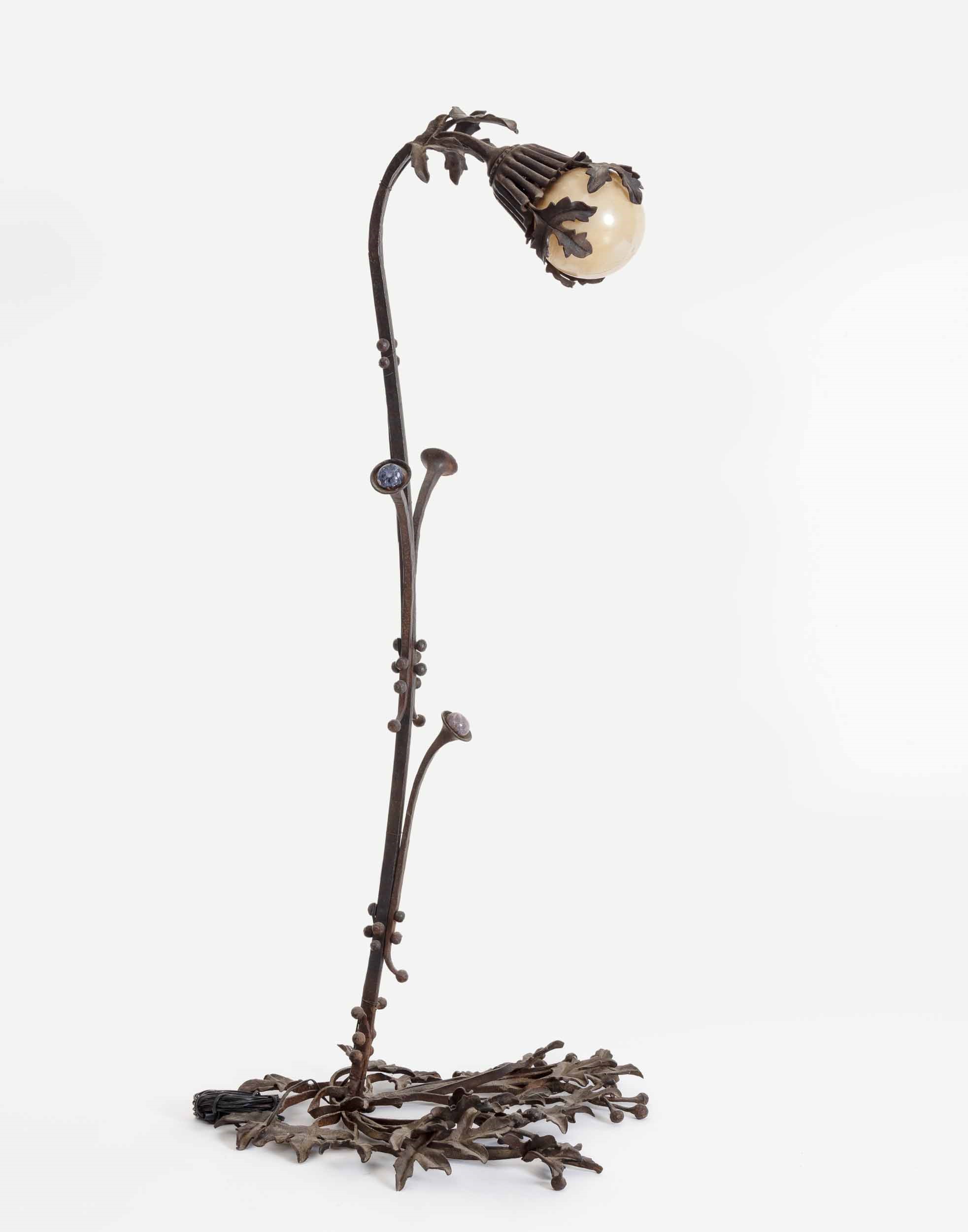 Rara lampada in ferro lavorato con basamento triangolare a foglie. Diffusore in vetro sferico con supporto a campana traforata e decoro di rami con paste vitree.