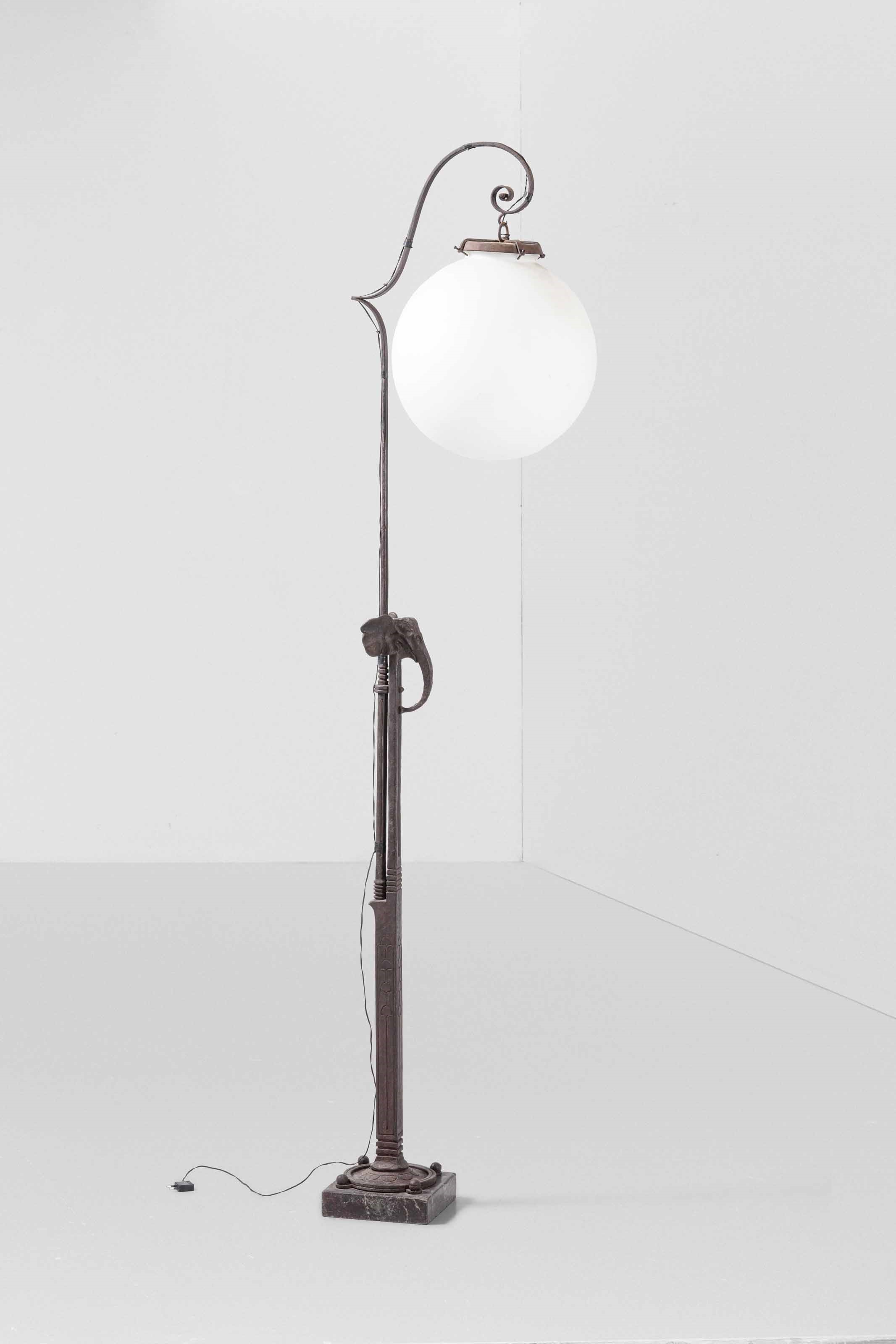 Grande lampada da terra in ferro con basamento in marmo, decoro di testa di elefante montata a colonna.