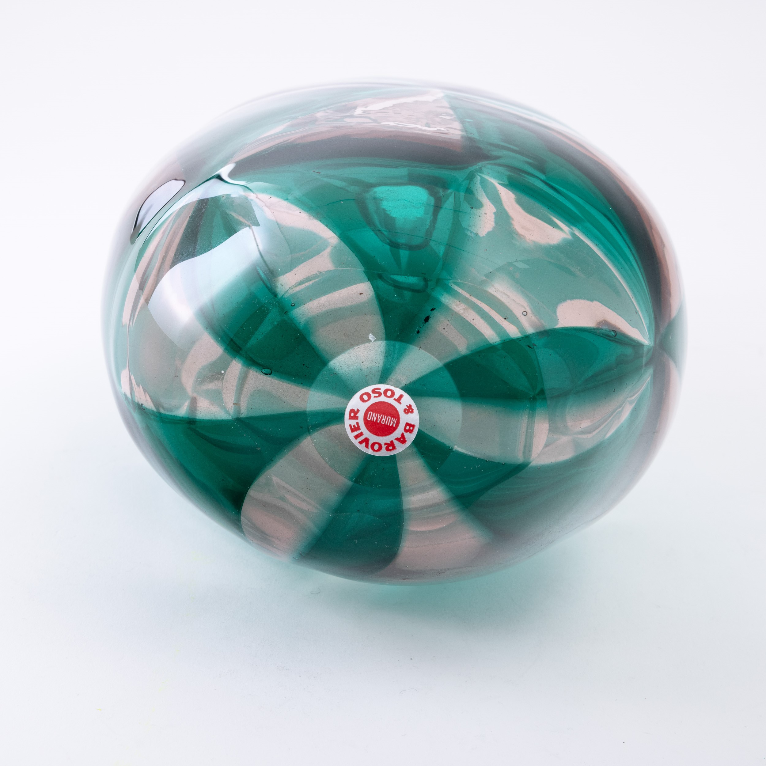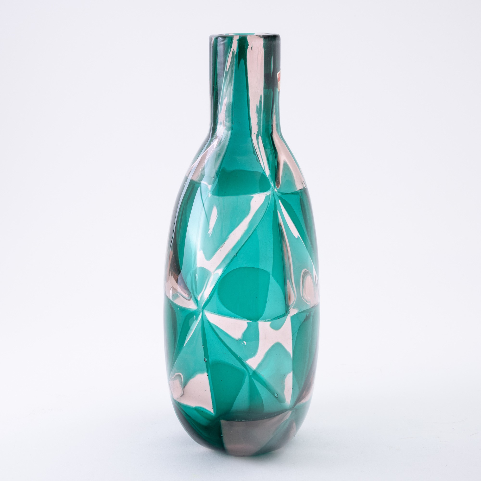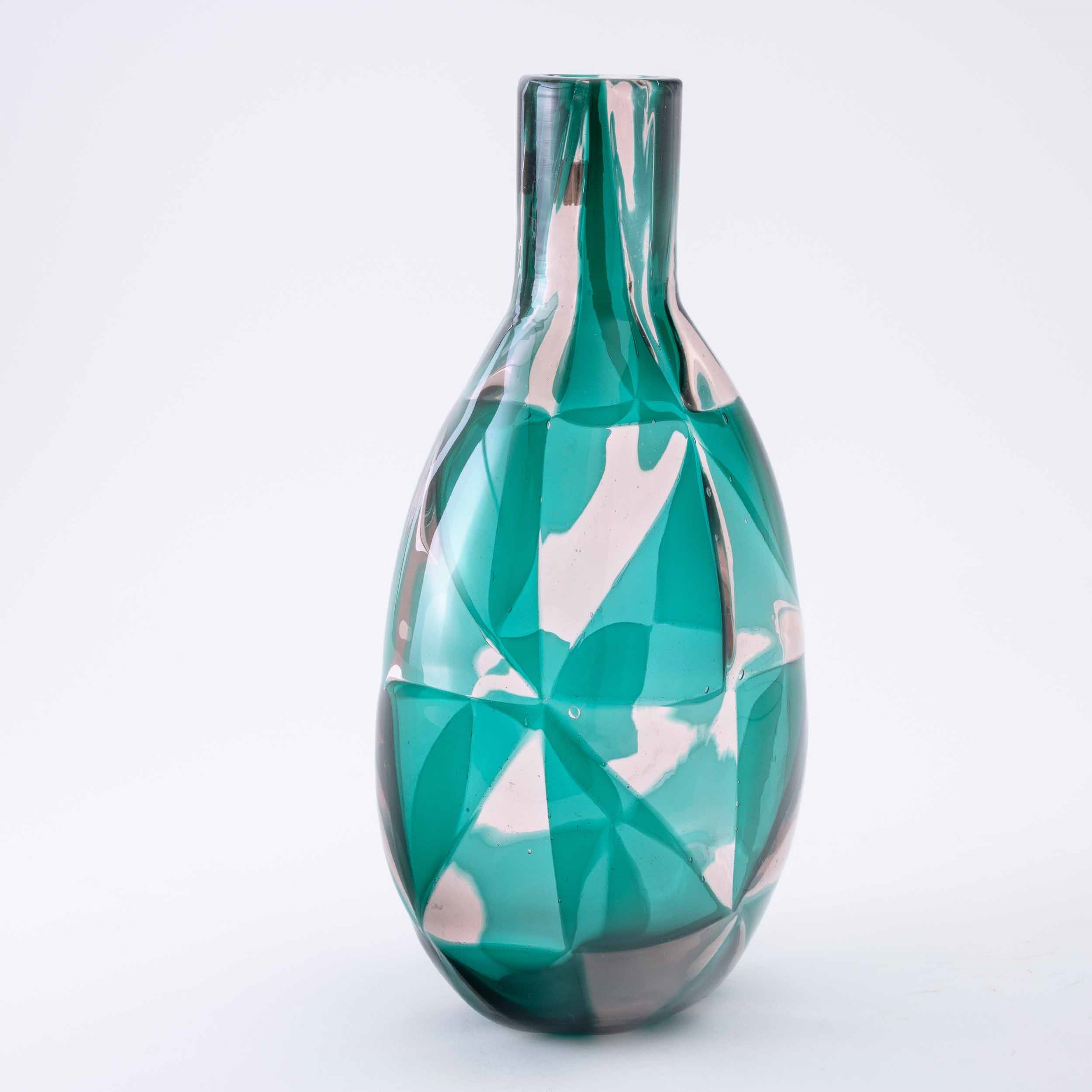 Vaso a uovo a sezione ovale con alto collo serie Intarsio con decoro policromo verde violetto.