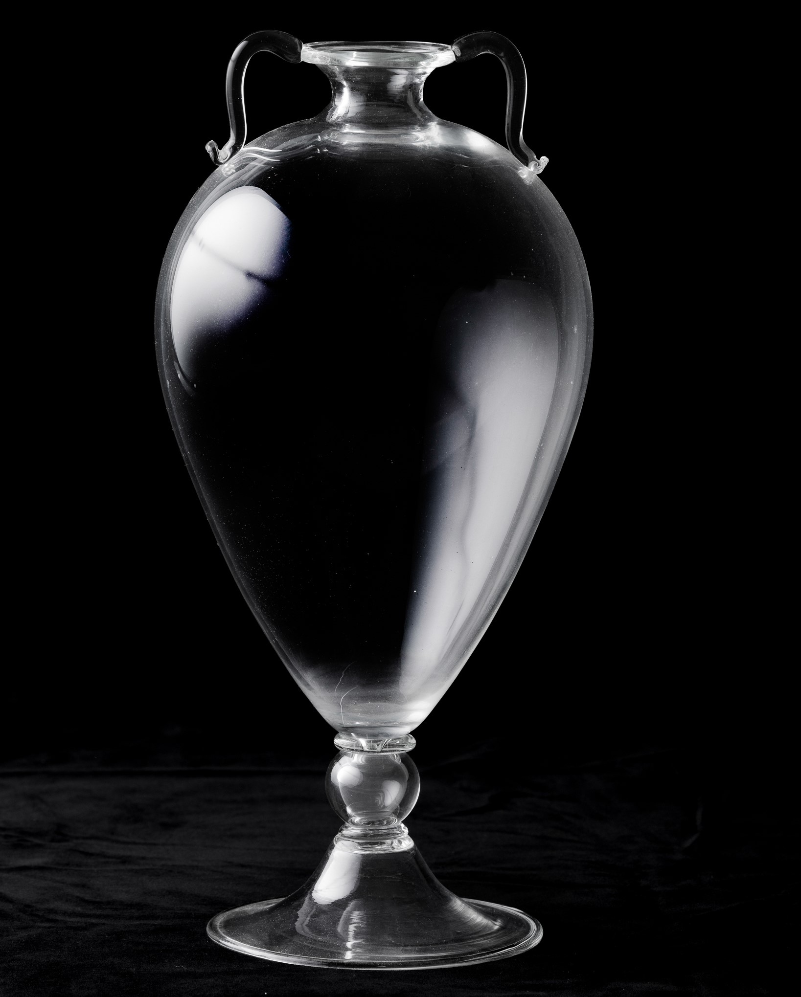 Vaso Veronese in vetro soffiato trasparente con anse applicate.