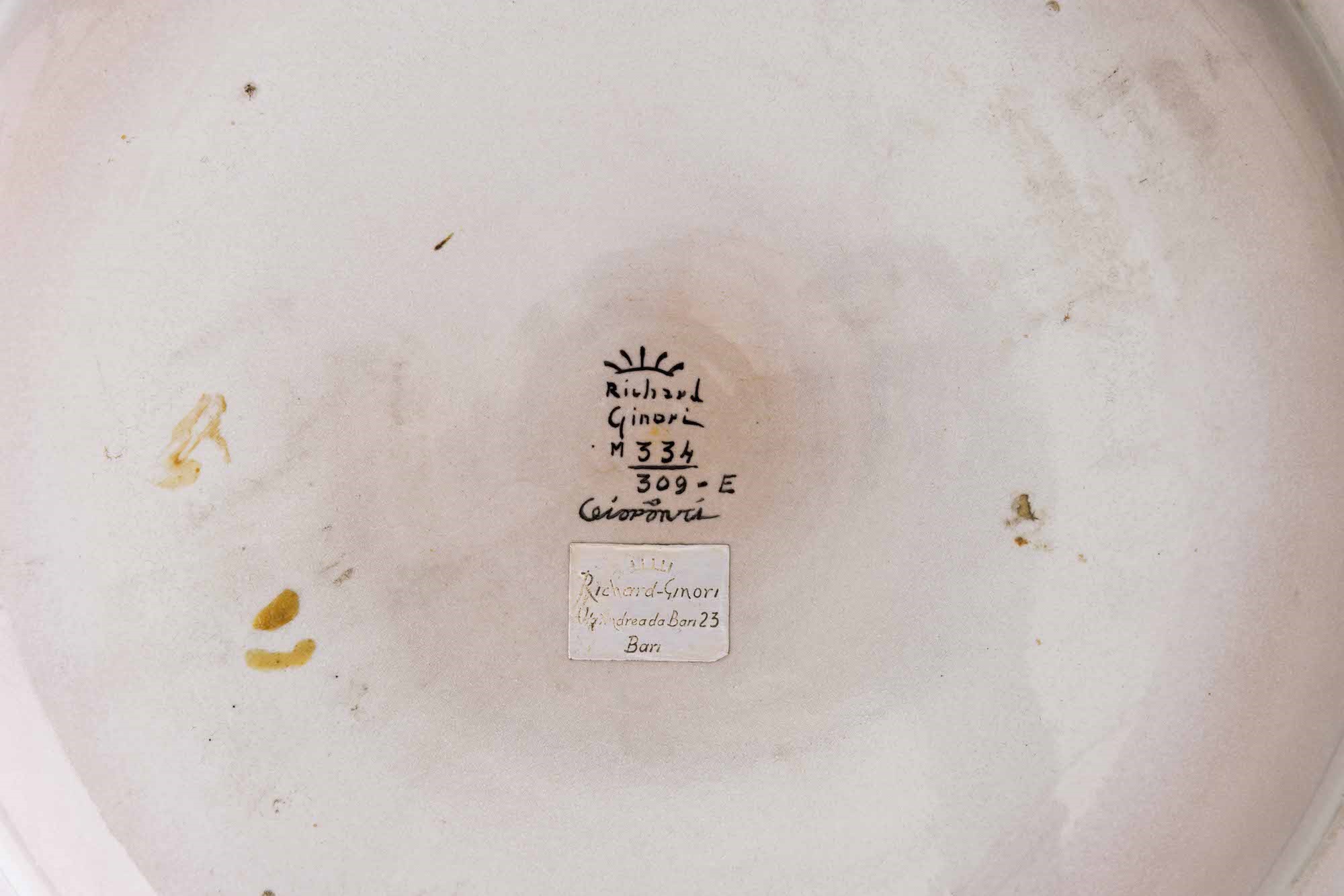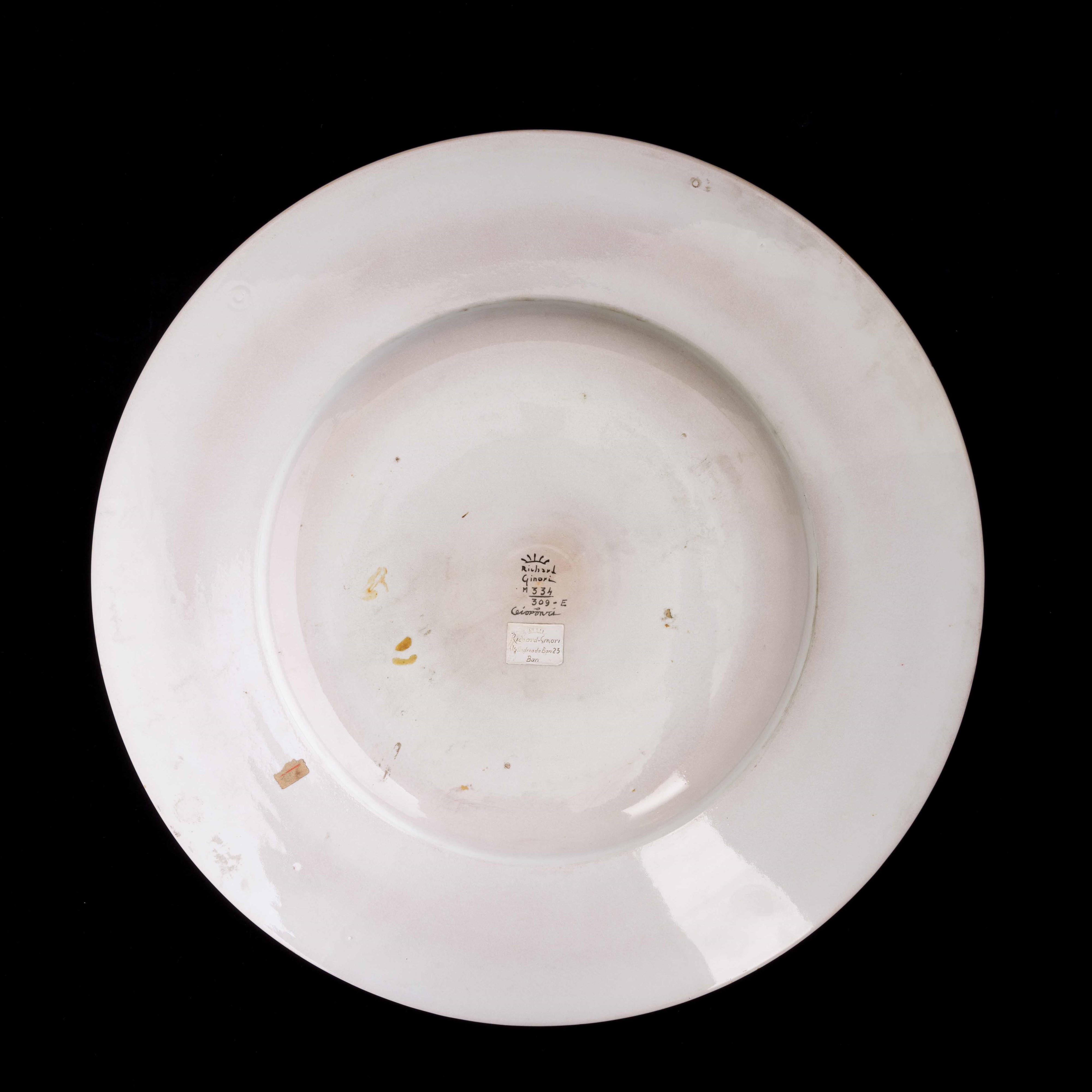 Grande piatto in terracotta maiolicata con decoro nel cavetto di nudino di donna appeso per le funi e sul fondo paesaggio di architetture classiche. Nella tesa decoro di pilastrini rastremati a raggiera. Firma dell’autore e marchio della manifattura Vecchia etichetta alla base