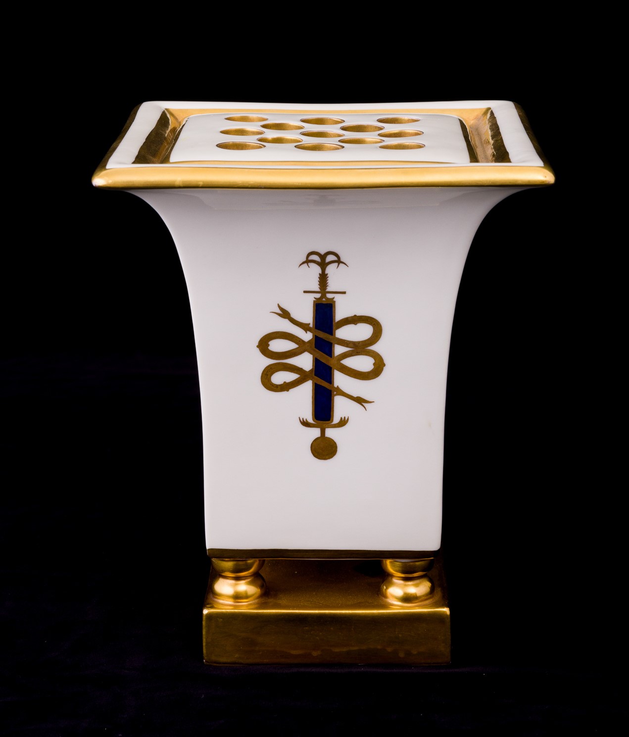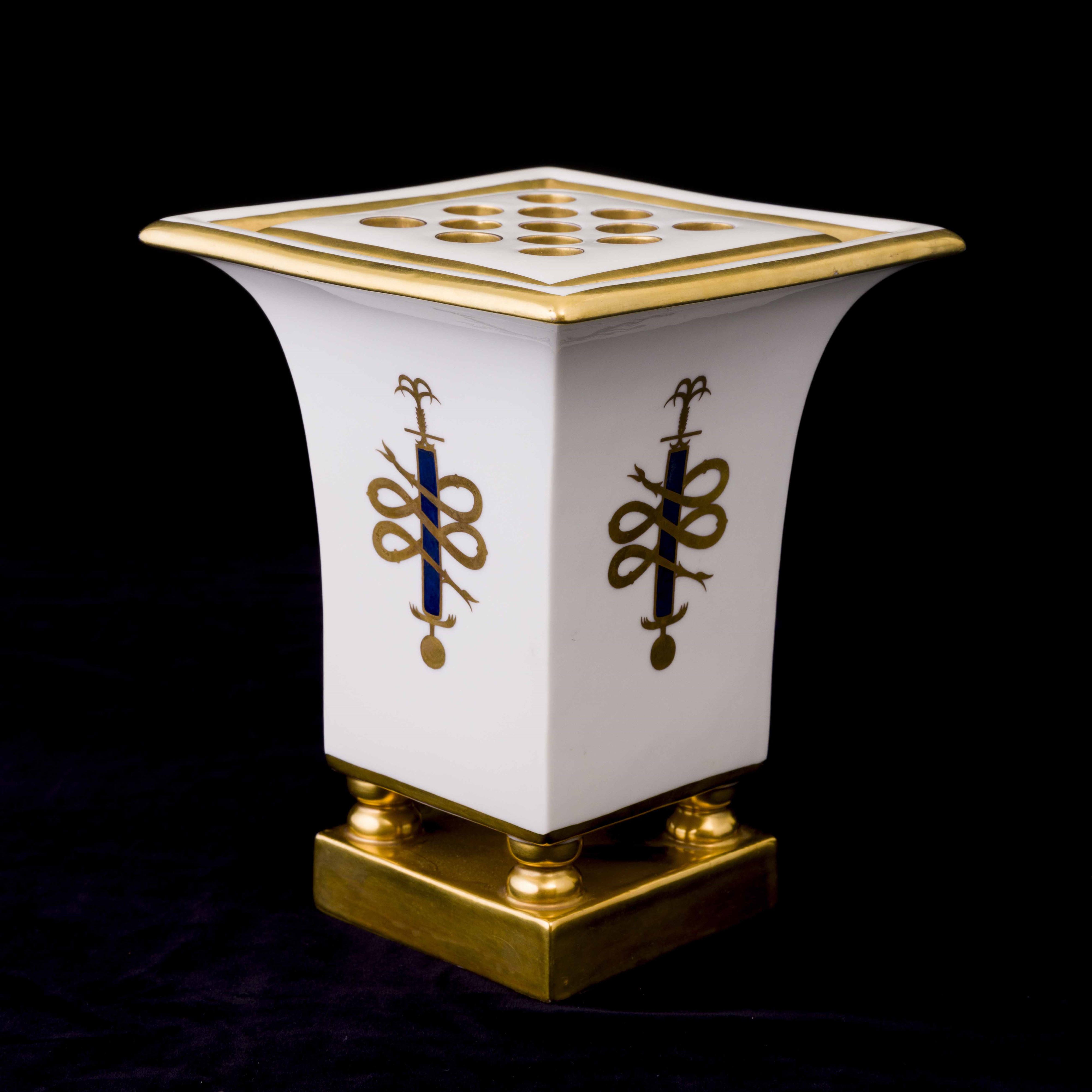 Vaso per fiori in porcellana a forma di capitello quadrato su basamento con decoro policromo e oro lavorato a punta d'agata.