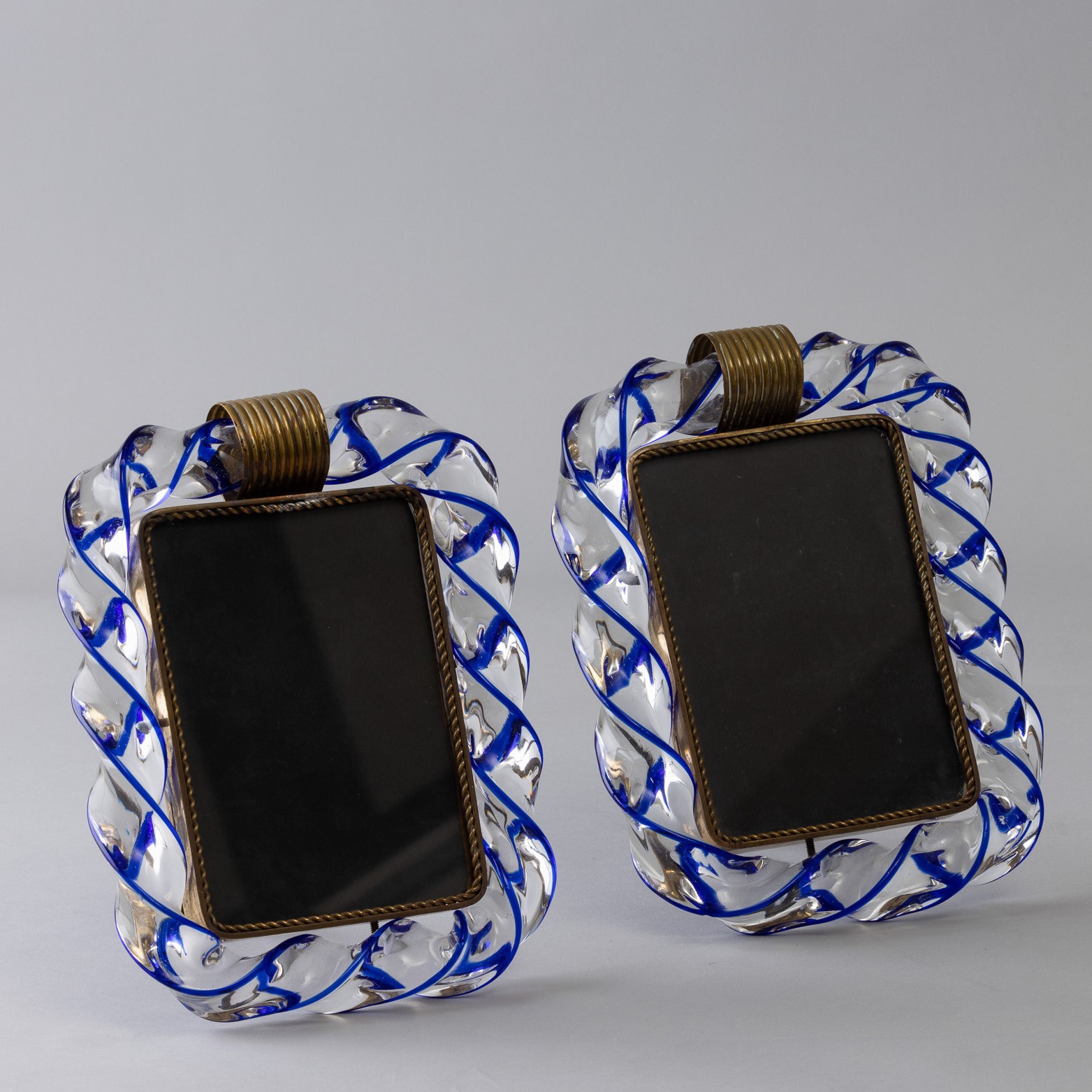 Coppia di portaritratti in ottone con cornice in vetro a torciglione e decoro di canne blu.