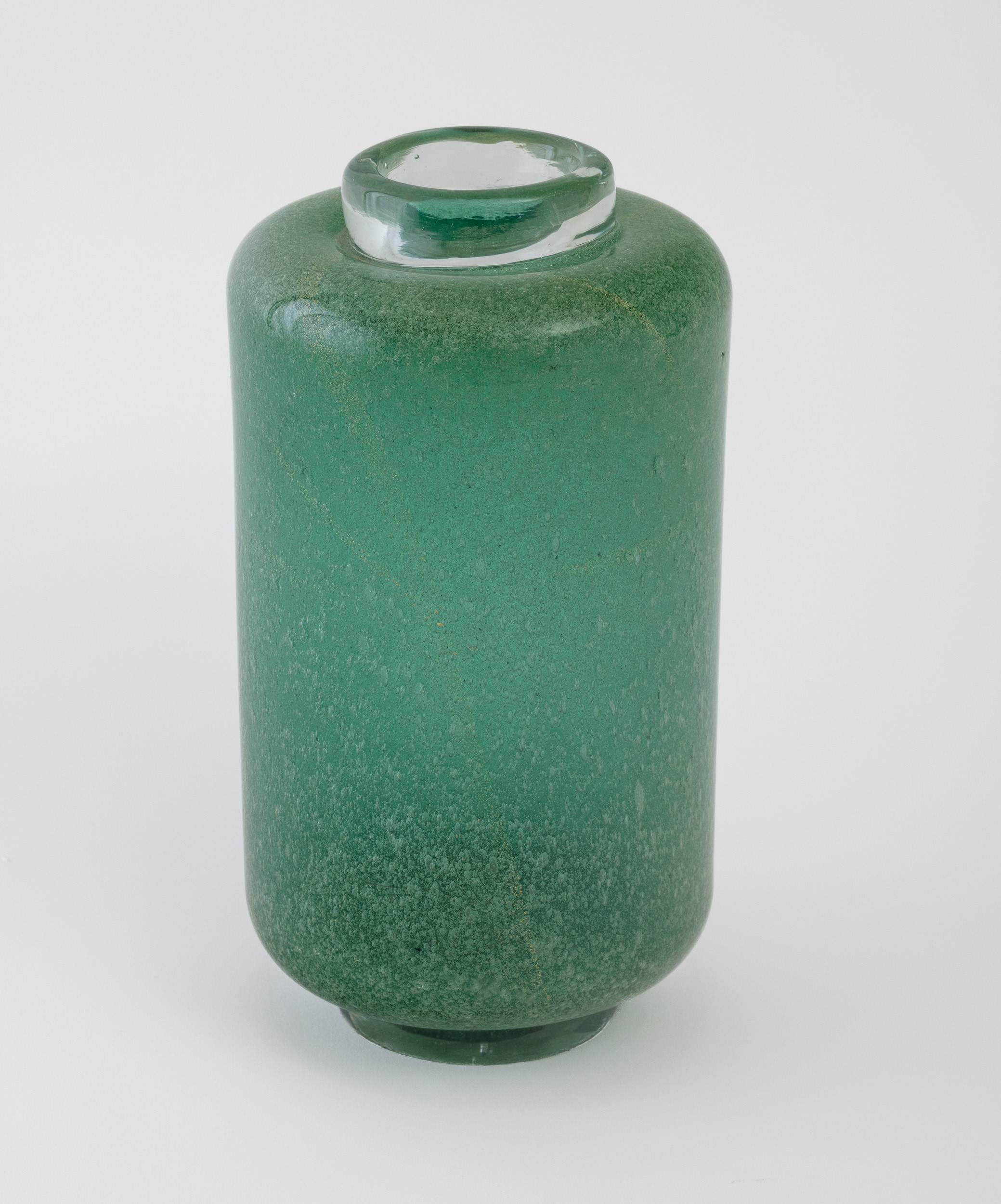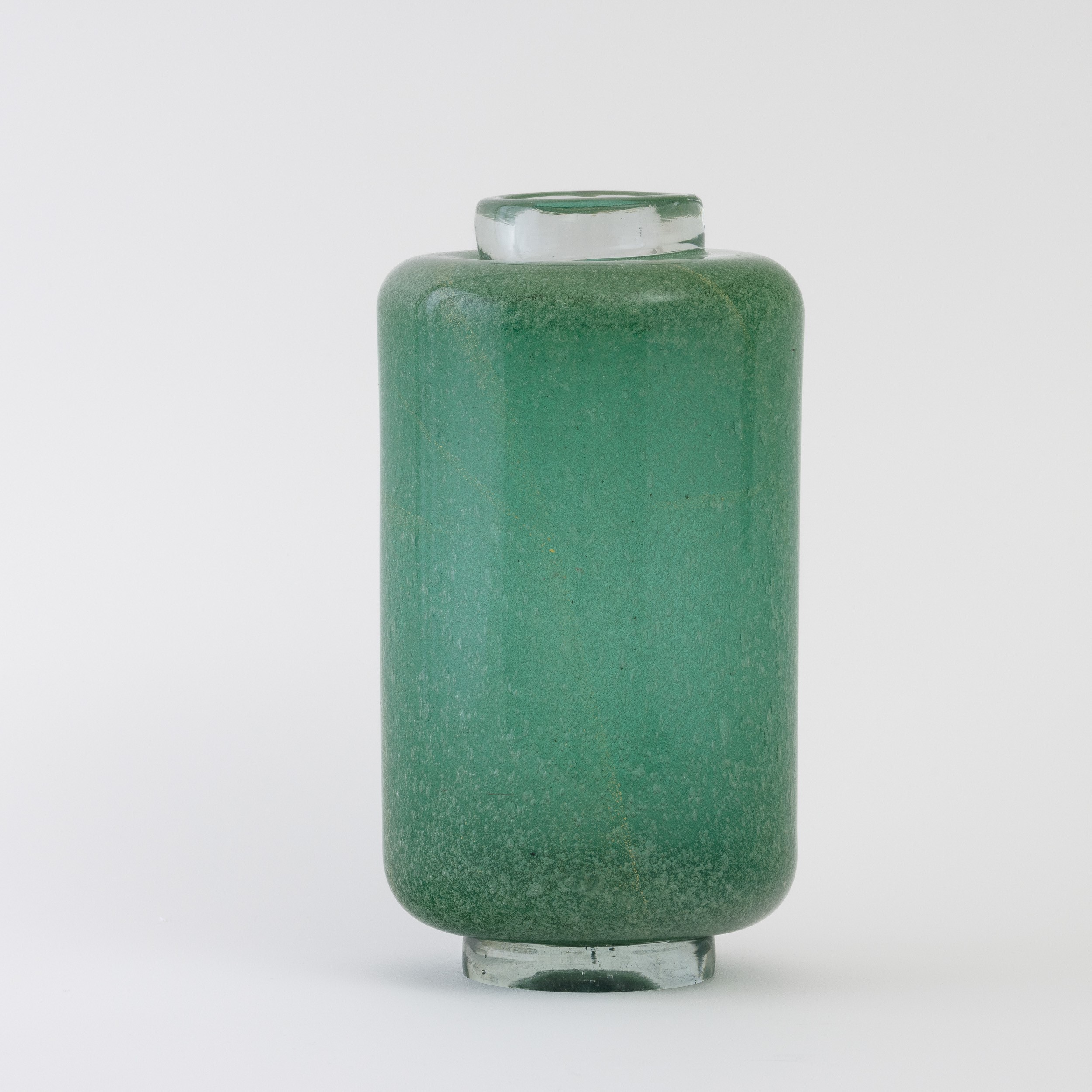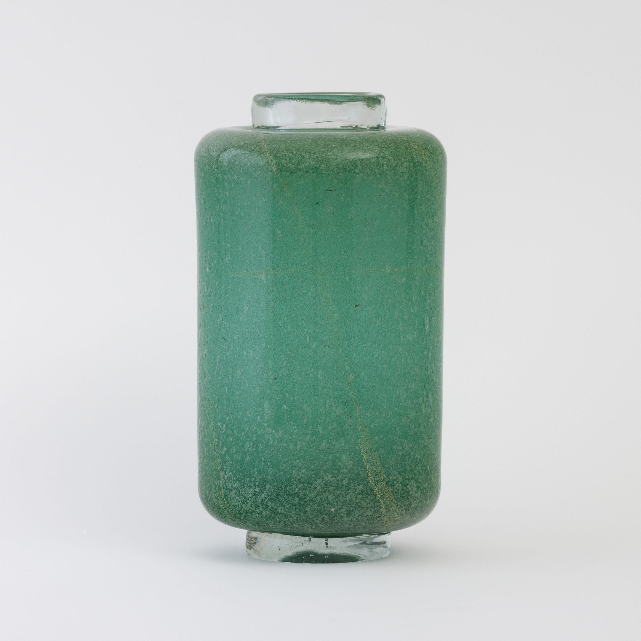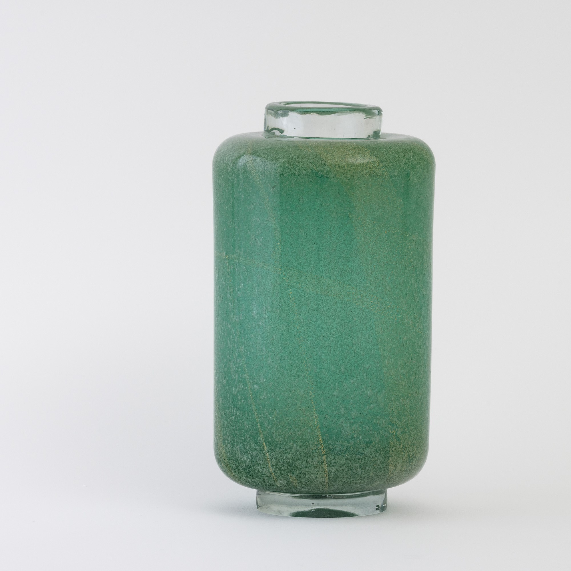 Grande vaso cilindrico in vetro A Bollicine verde con decoro in foglia oro sommersa. Piede e collo ad anello applicati.