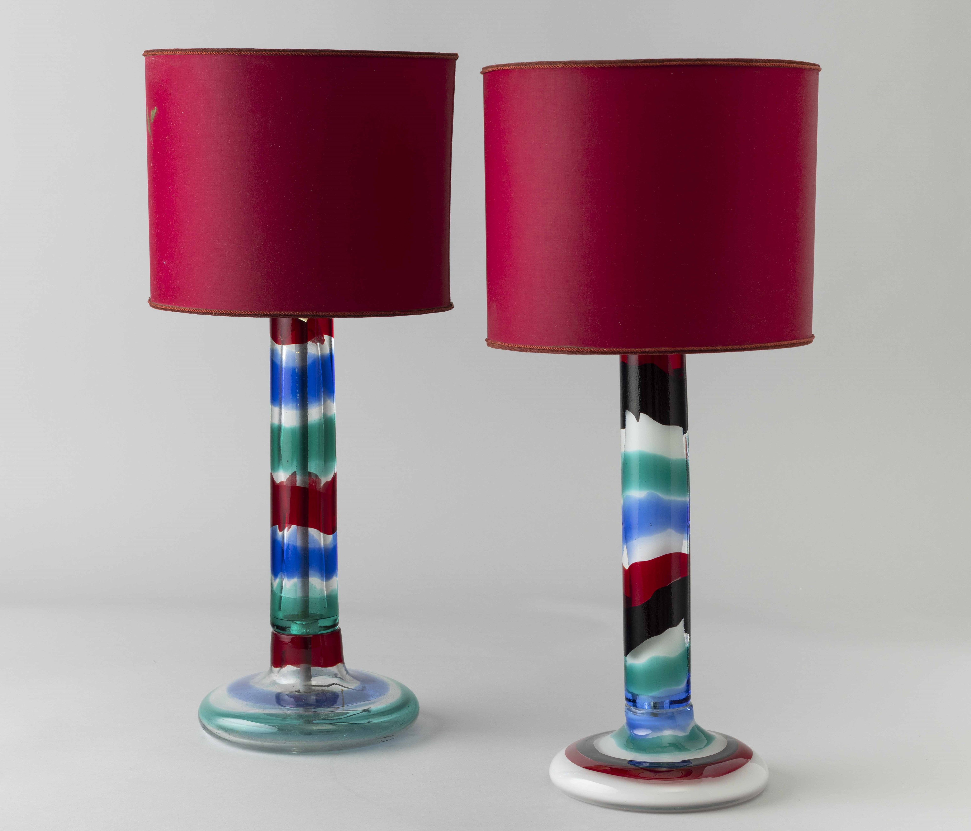 Coppia di lampade da tavolo in vetro soffiato a fasce orizzontali policrome, una in vetro sommerso lattimo. Paralumi originali.